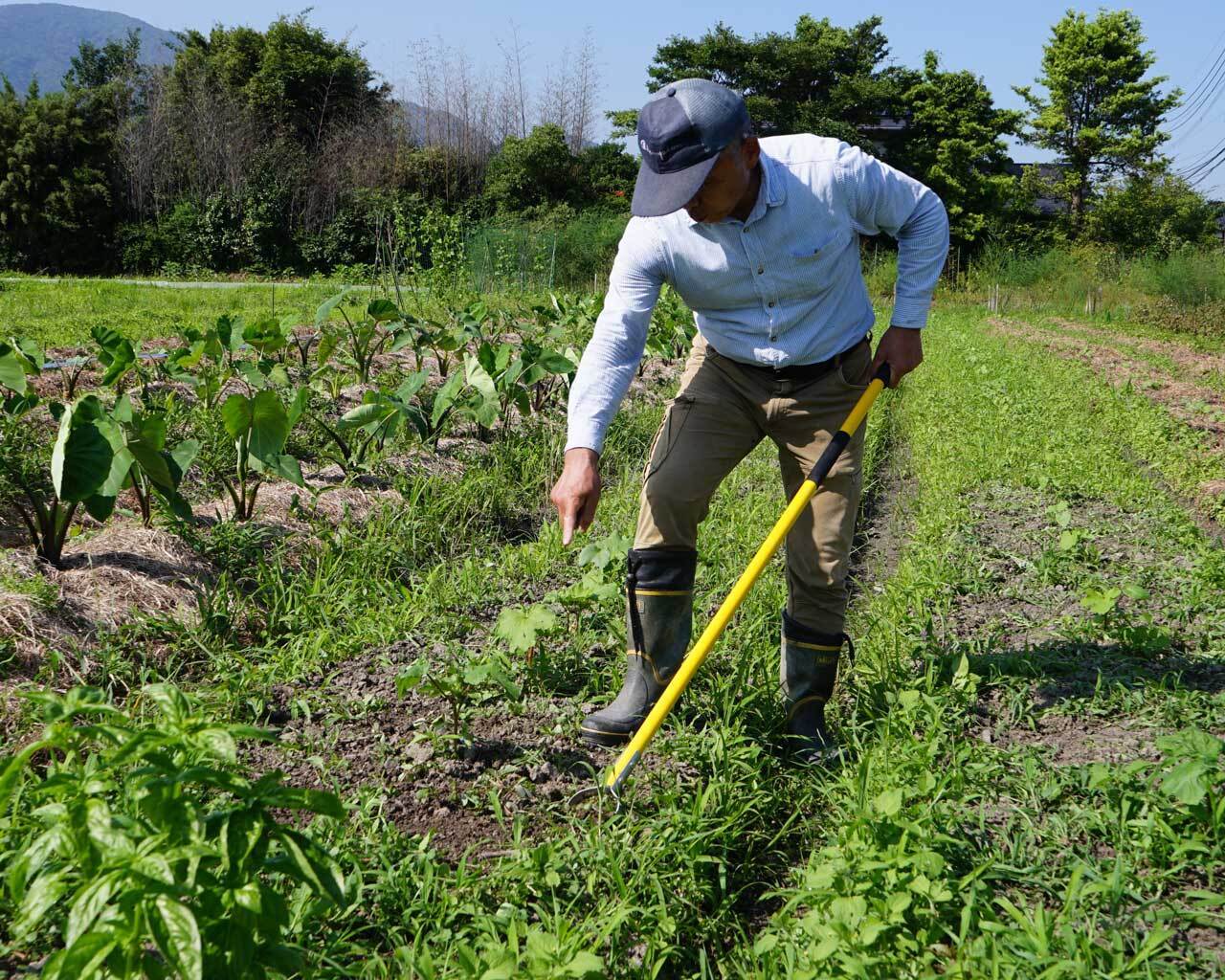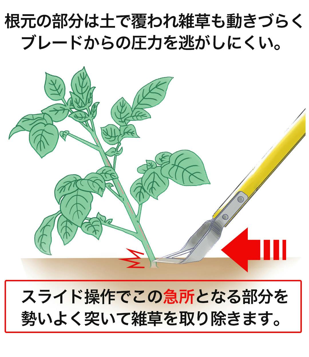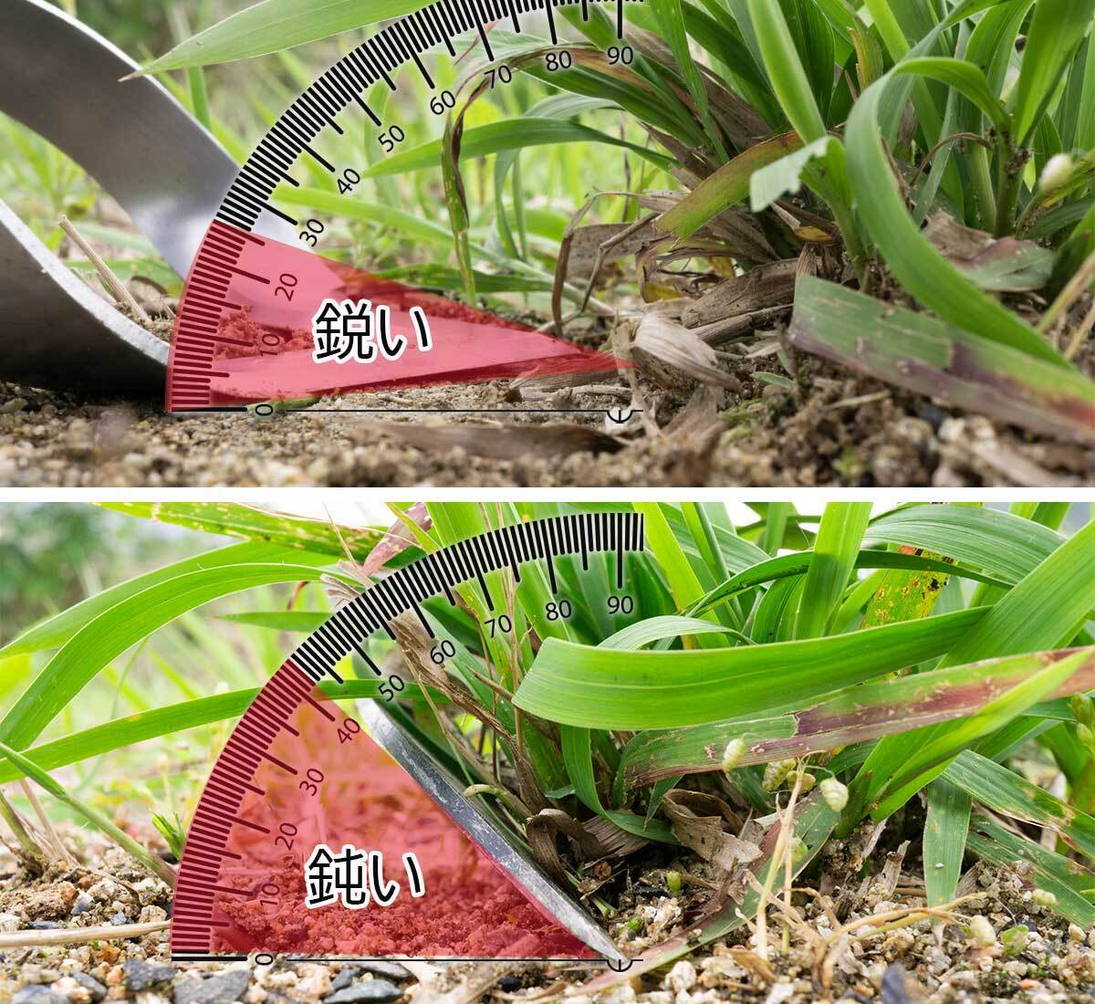 操作によっては道具の進入角度がばらつき雑草が取りづらくなるケースも。対して地表をすべらせると雑草に対して垂直なアプローチするため、結果、刃先を最大限に活かして鋭く雑草を取り除くことにもつながります。