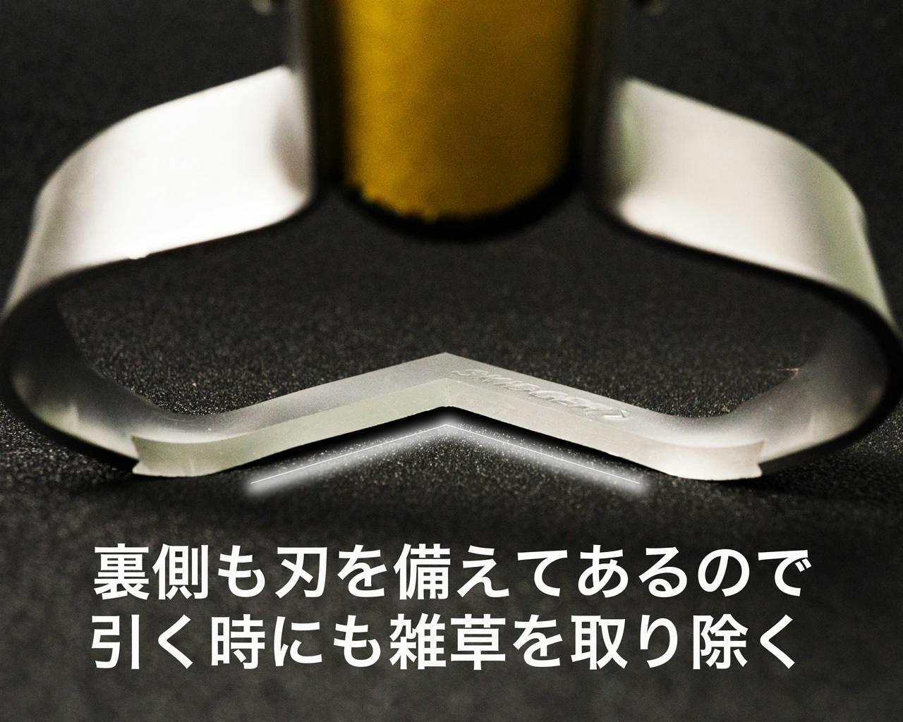 押して前方を刈り、裏の刃で引いて刈ることができます。