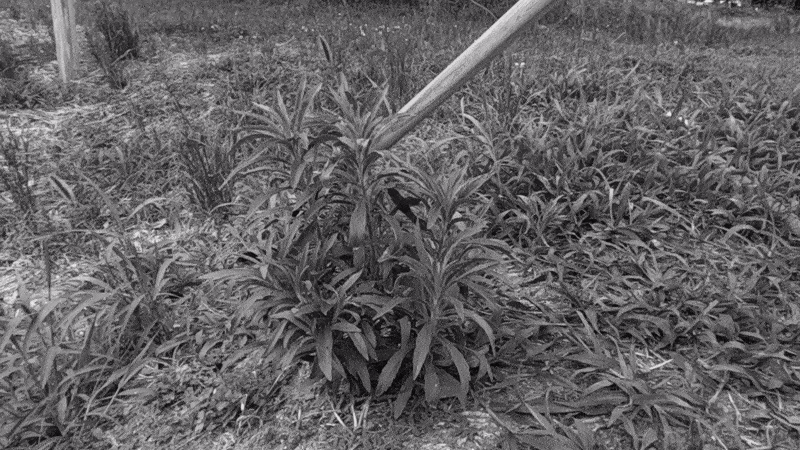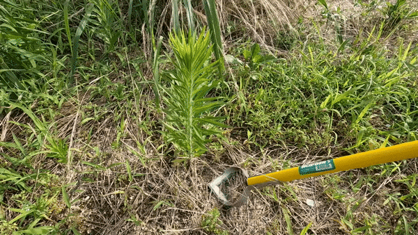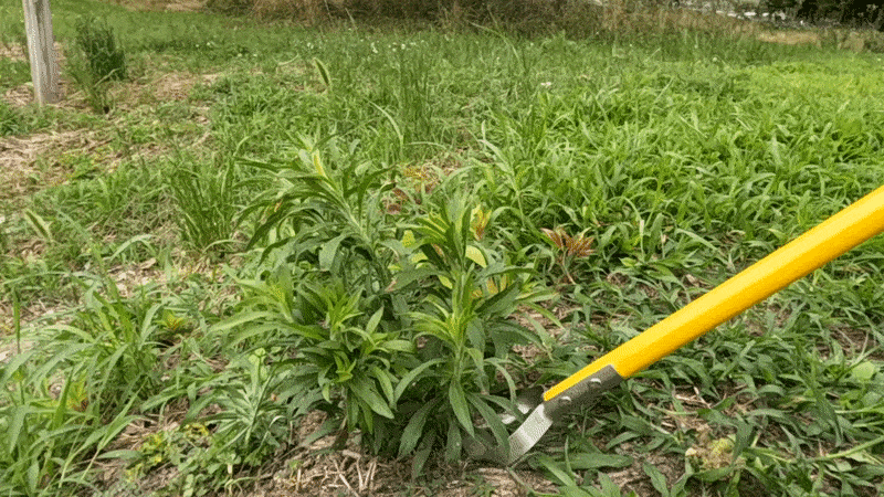 また、スライドさせにくい場所などはスコップのように振り下ろし、根元へ刺し込んで除草することもできます。ブレードが小型なので地面に食い込みやすく、さらに土も抜けるので押しやすいライトニングならではの刈り方です。