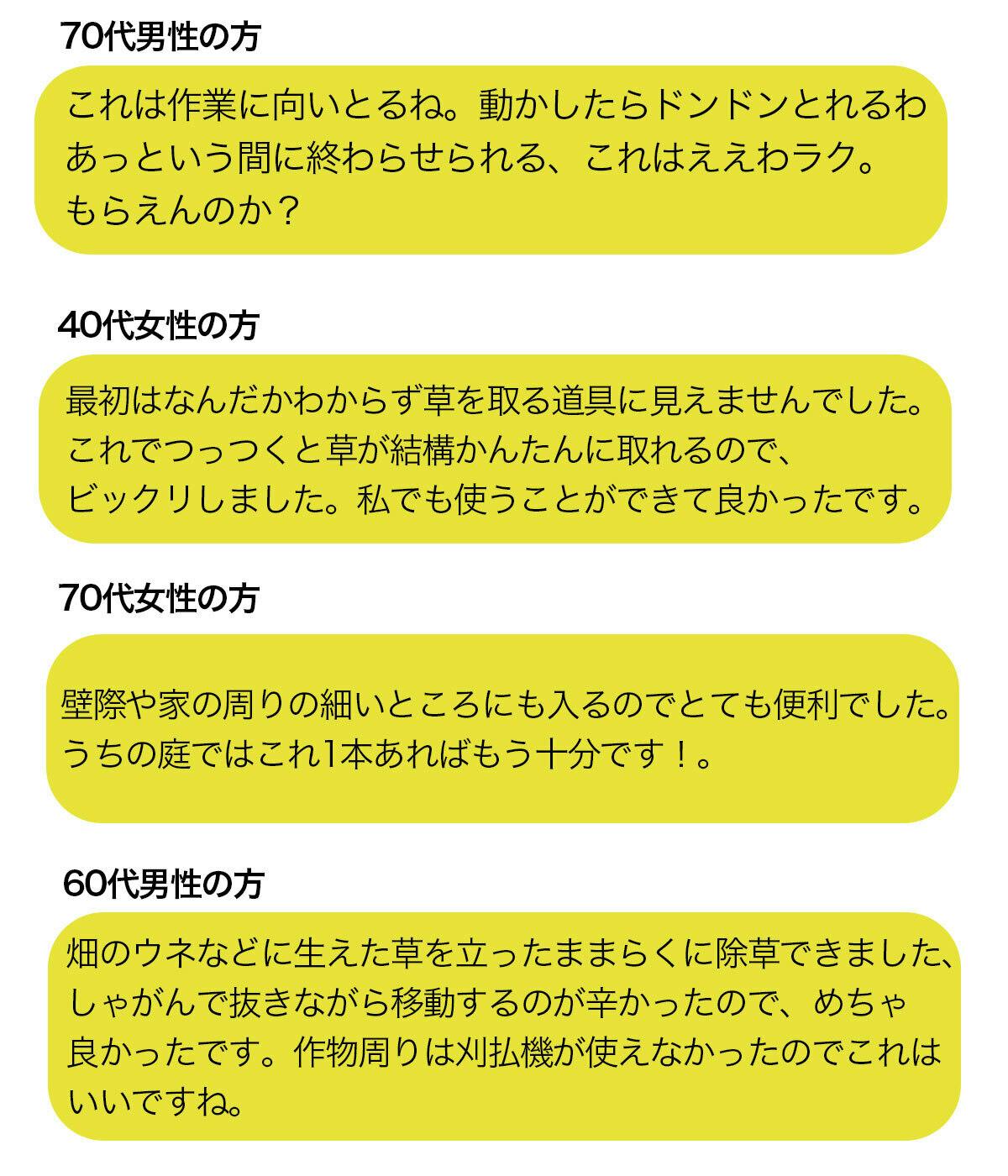 燃料や電気、薬剤も使わないので、気になった時にすぐに手に取って使えるのも便利です。マイペースで作業できて、自力で行う満足感も魅力的です。