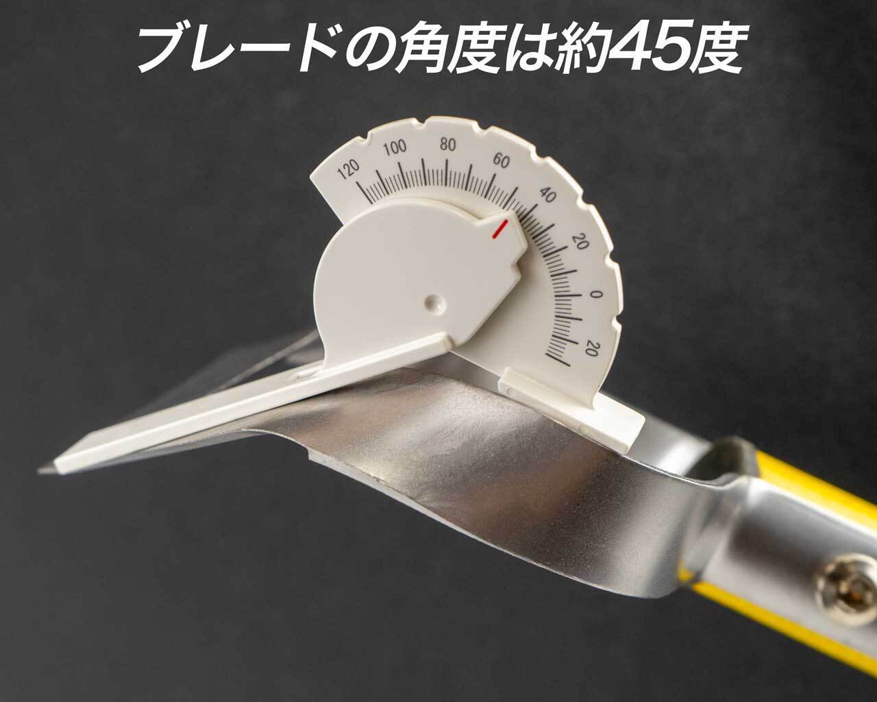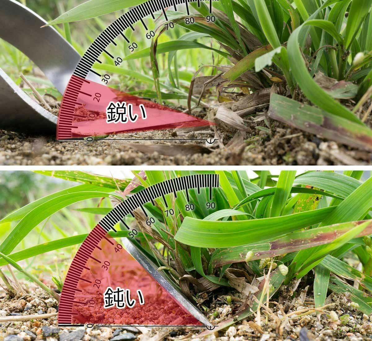 スキッジャーでの草取りは、まず刃が雑草へ食い込むことが重要なので刃角は鋭く仕上げています。鋭利な刃先には雑草の表皮にキズをつけて切り込む役割があります。