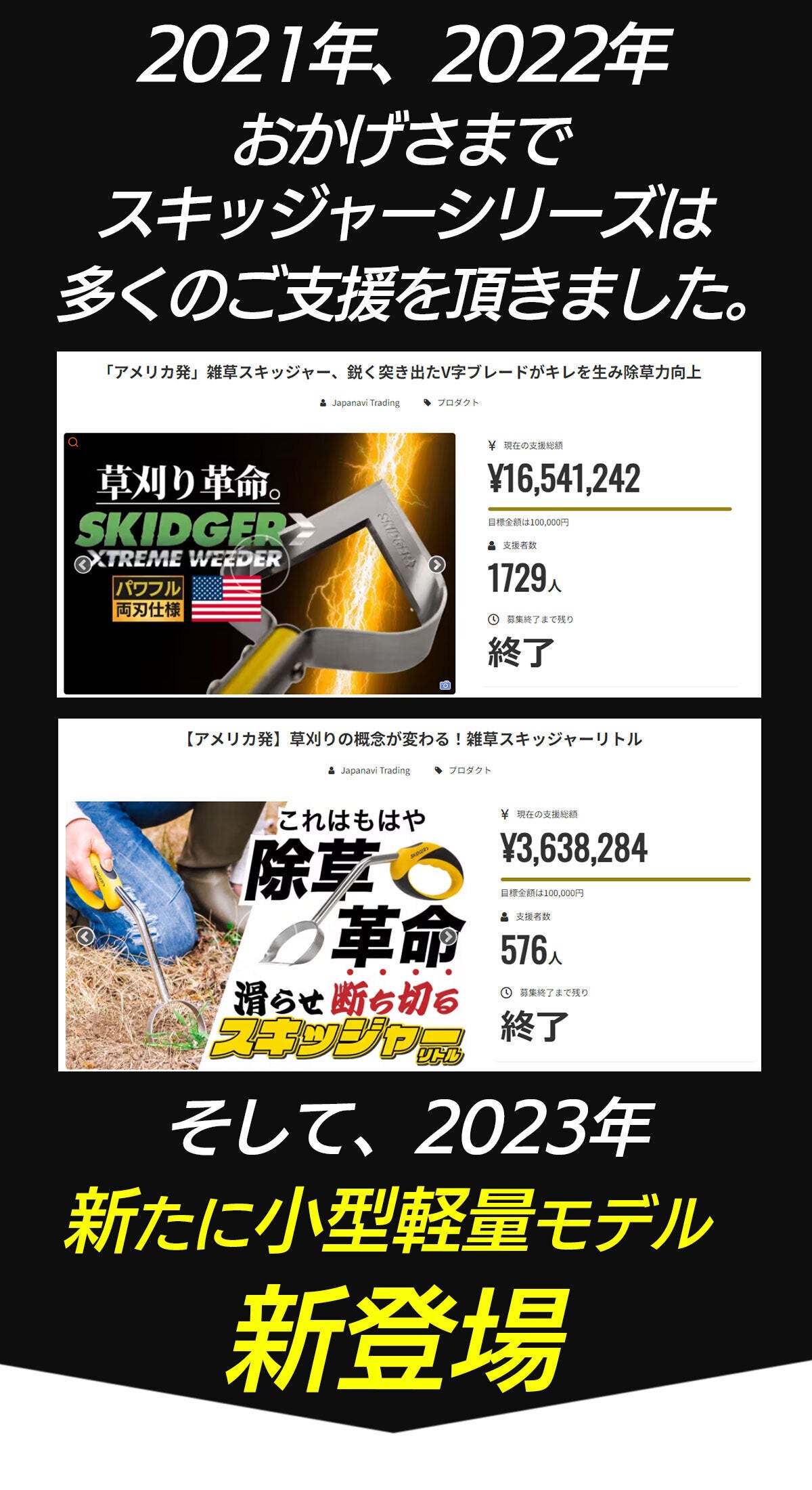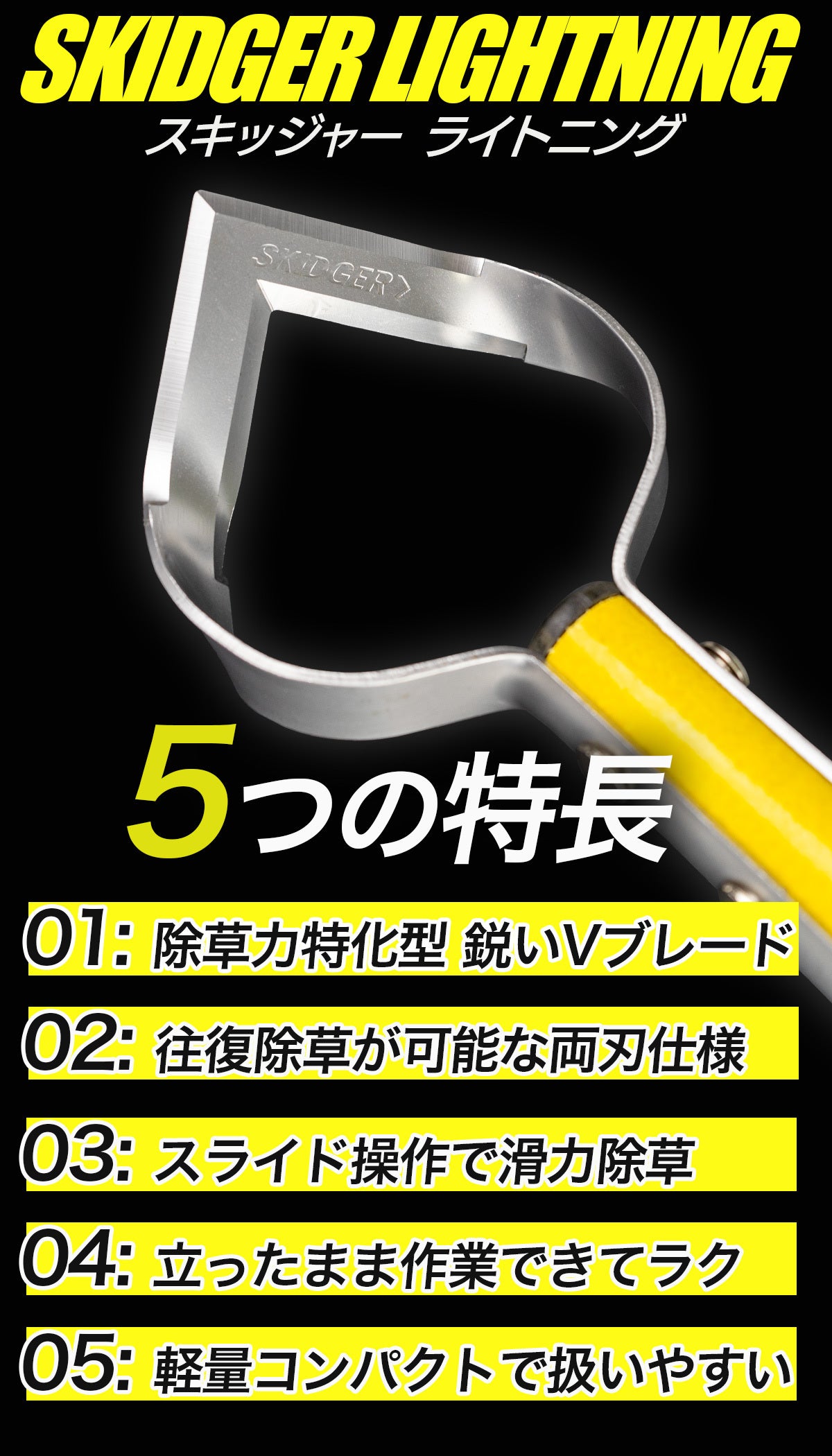 日本のユーザー様から頂いたご意見をもとに再考し、このライトニングモデルは誕生いたしました。手にとってお試しいただければ、思わず「コレ!」となる、即戦力のお気に入り道具の1つになるかもしれません。これから先も毎年訪れる草取りの時間に、楽しさもプラスする。それが、スキッジャーライトニングがもたらす新しい体験です。あなたの夏の日々を、より豊かに、より快適に。新たな夏の風景が広がればうれしいです。