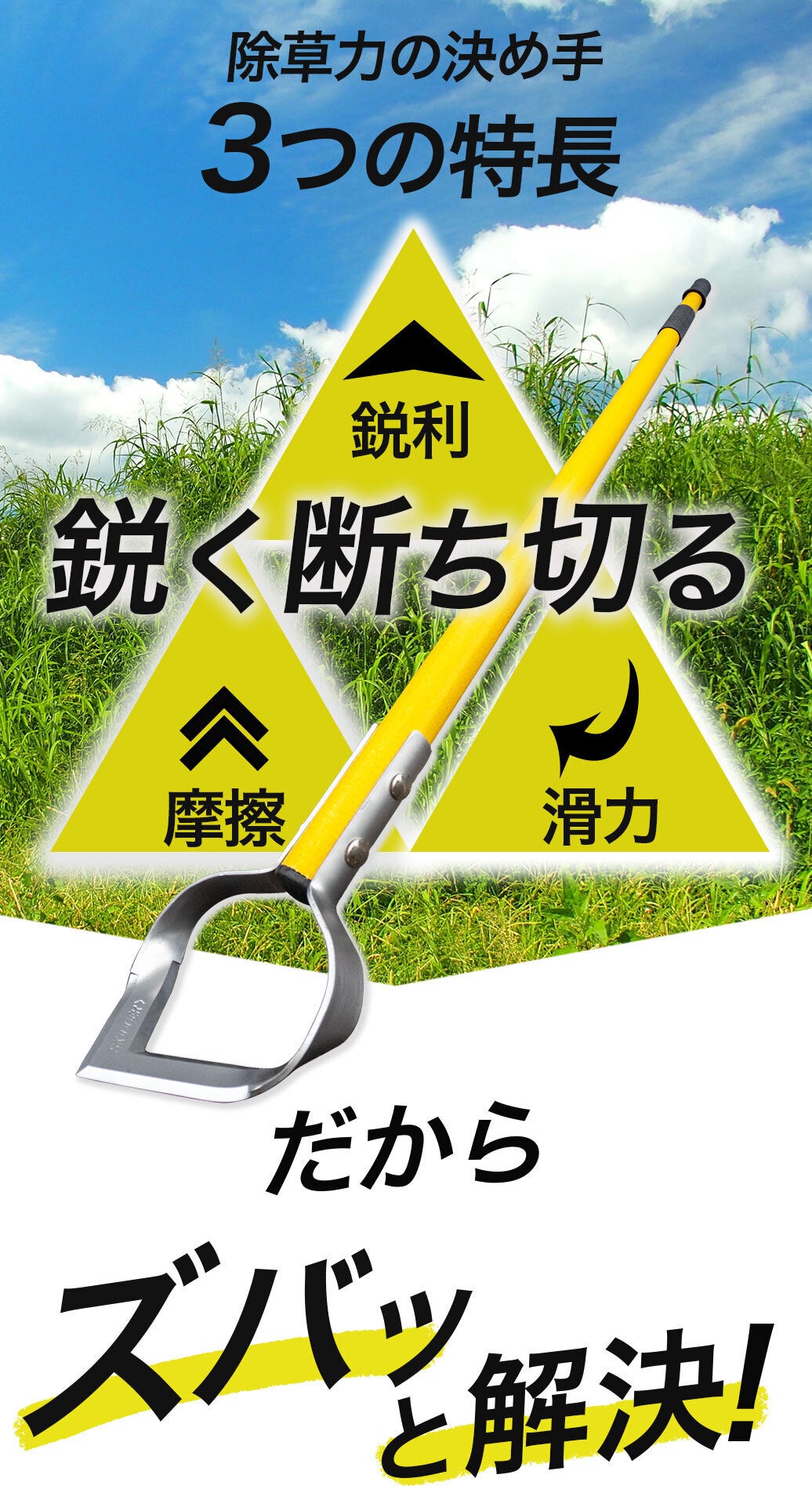 「鋭利」「摩擦」「滑力」これらの3つの要素で革新的な草取りを実現。ズバッとクリティカルな除草シーンが増えると、気分も良くなり作業もはかどります。