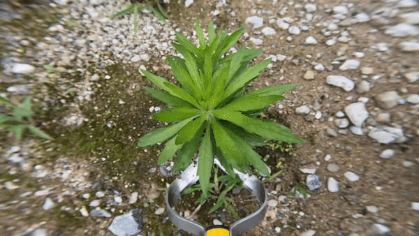 固定したブレードにペットボトルを落として鋭さを検証してみました。ズバッと切り裂いて貫く様子が観察できます。このポテンシャルをそのまま雑草へぶつけます。特徴的なV字形状はとにかく草を取り除くことに特化した合理的な形状なのです。