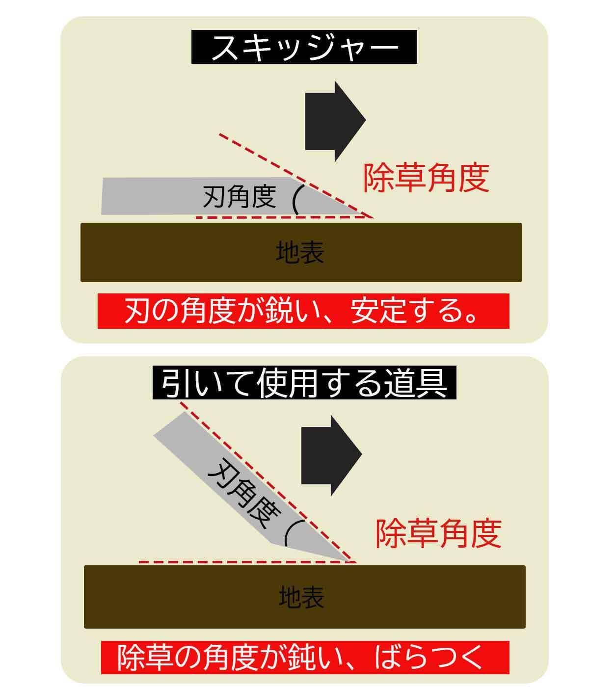 つまり身長などの影響によりスキッジャーの角度が変わるため、極端なケースでは身体に合わない長すぎる道具を使うと刈りづらいまま使用することになります。