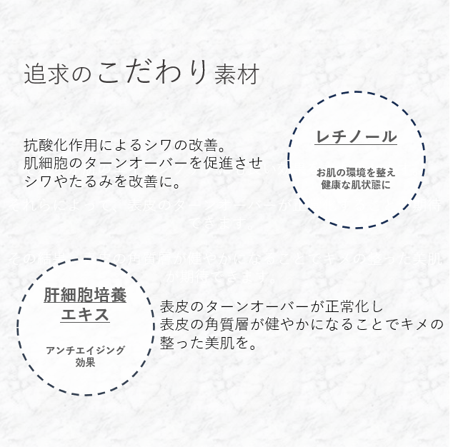 全成分:水、BG、ヒアルロン酸Na、乳酸桿菌/豆乳発酵液、ナイアシンアミド、レチノール、セラミドNP、セラミドAP、セラミドEOP、トウキ根エキス、加水分解コラーゲン、クズ根エキス、フィトスフィンゴシン、コレステロール、グリチルリチン酸2K、ベタイン、ヒドロキシエチルセルロース、乳酸、オタネニンジン根エキス、アルニカ花エキス、カミツレ花エキス、スギナエキス、アンズ種子エキス、オプンティアストレプタカンサエキス、ブクリョウエキス、パントテン酸Ca、イノシトール、アラントイン、ツボクサエキス、オウゴン根エキス、イタドリ根エキス、カンゾウ根エキス、チャ葉エキス、ローズマリー葉エキス、アロエベラ葉エキス、クロレラエキス、ラウロイルラクチレートNa、カルボマー、キサンタンガム、フェノキシエタノール