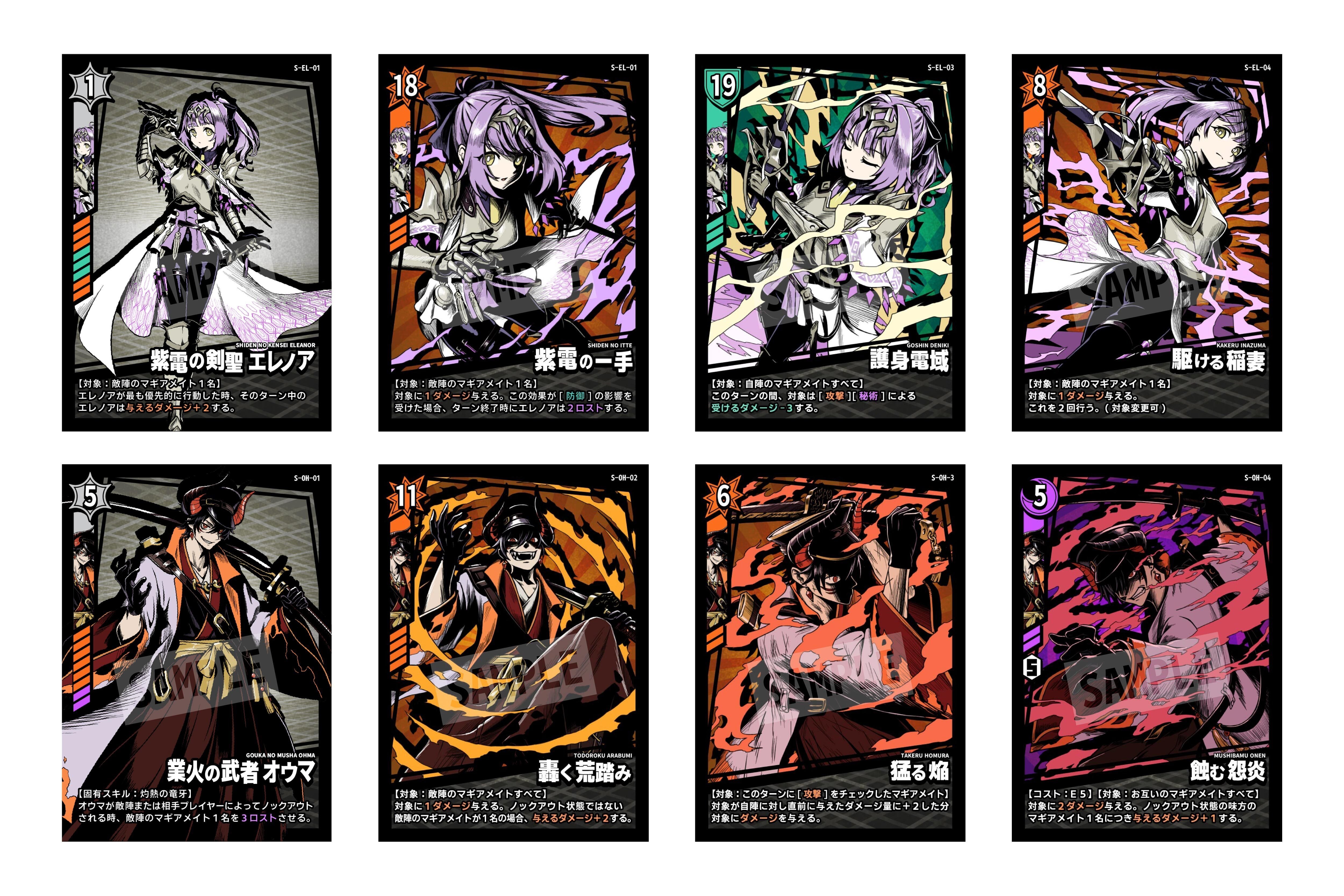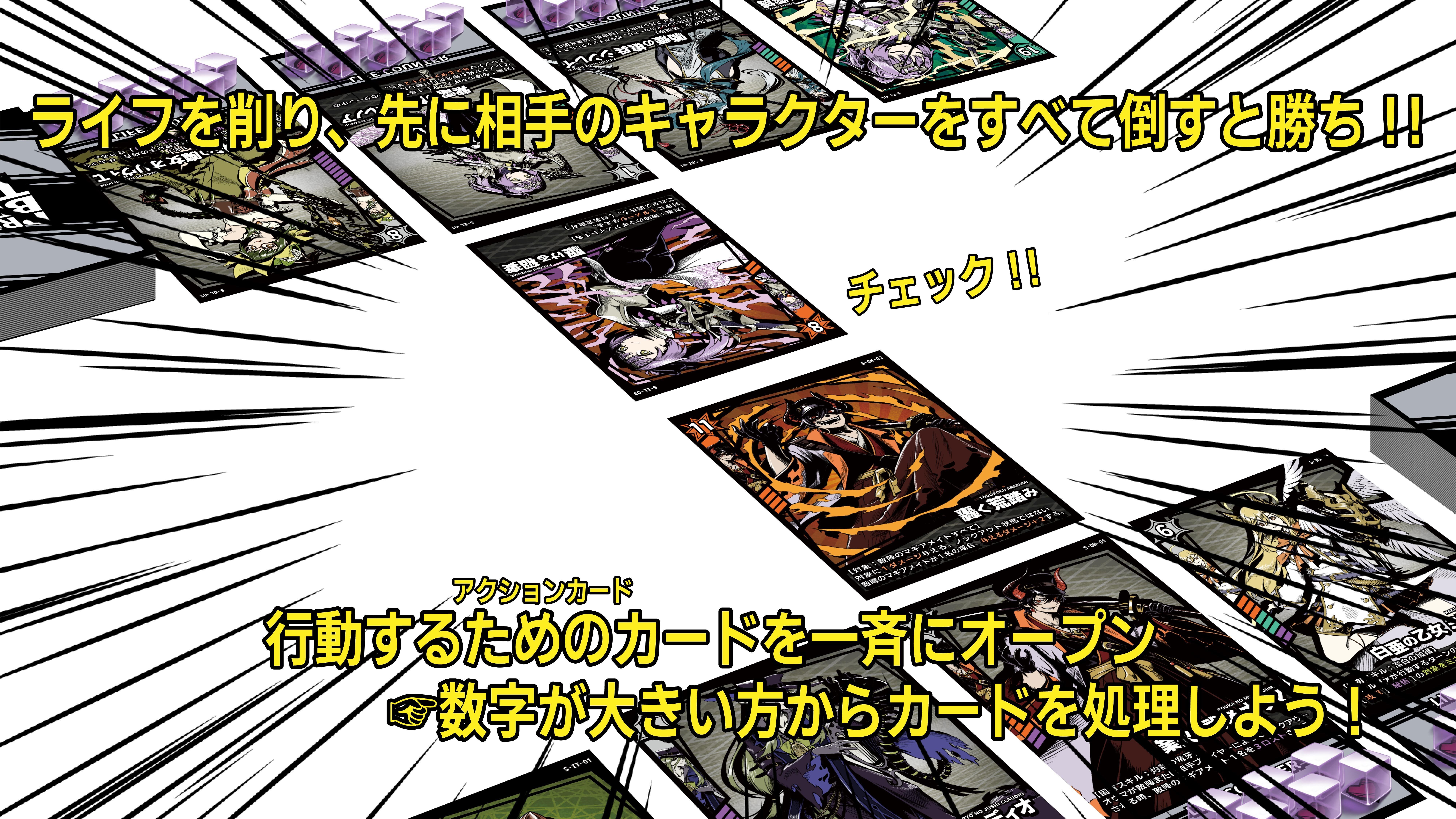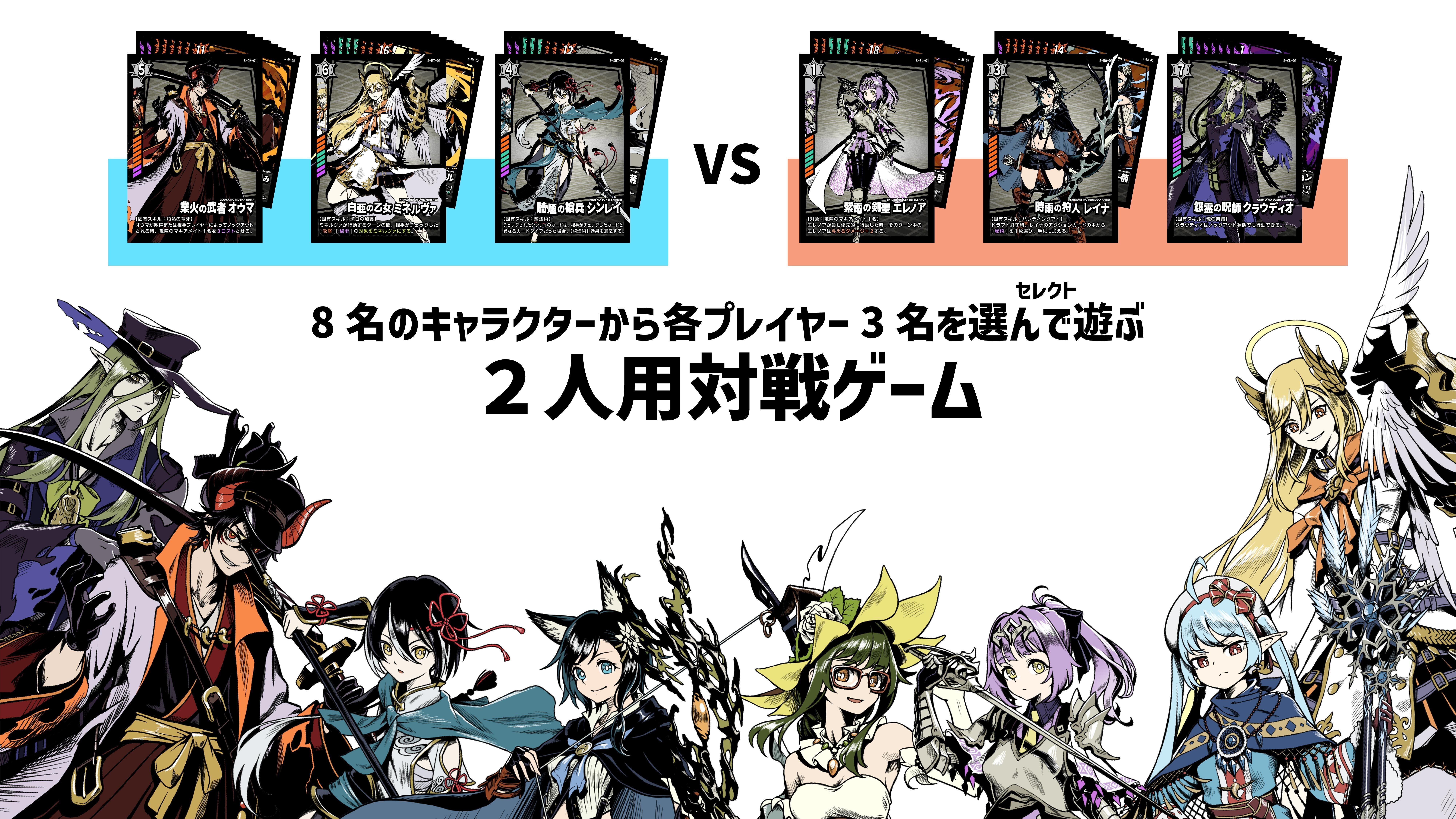 8名のキャラクターと他40枚のイラストで魅せるスタイリッシュなカードデザイン。好きなキャラクター、好きな戦術を活かし、心理戦を勝ち抜き相手のライフを削り切って勝利を目指すスピード感のある対戦カードゲームです。ぜひ手に取っていただき、体験してみてください。