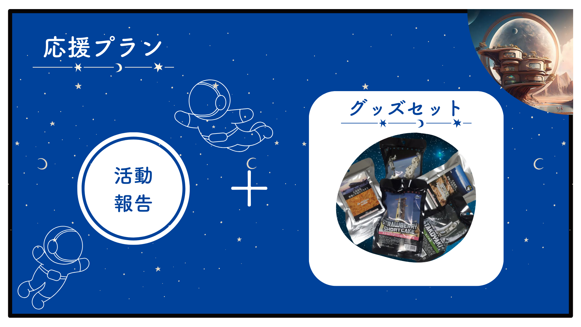 活動報告書に加えて、グッズセット(宇宙食・高原野菜の詰め合わせ)をお送りいたします!