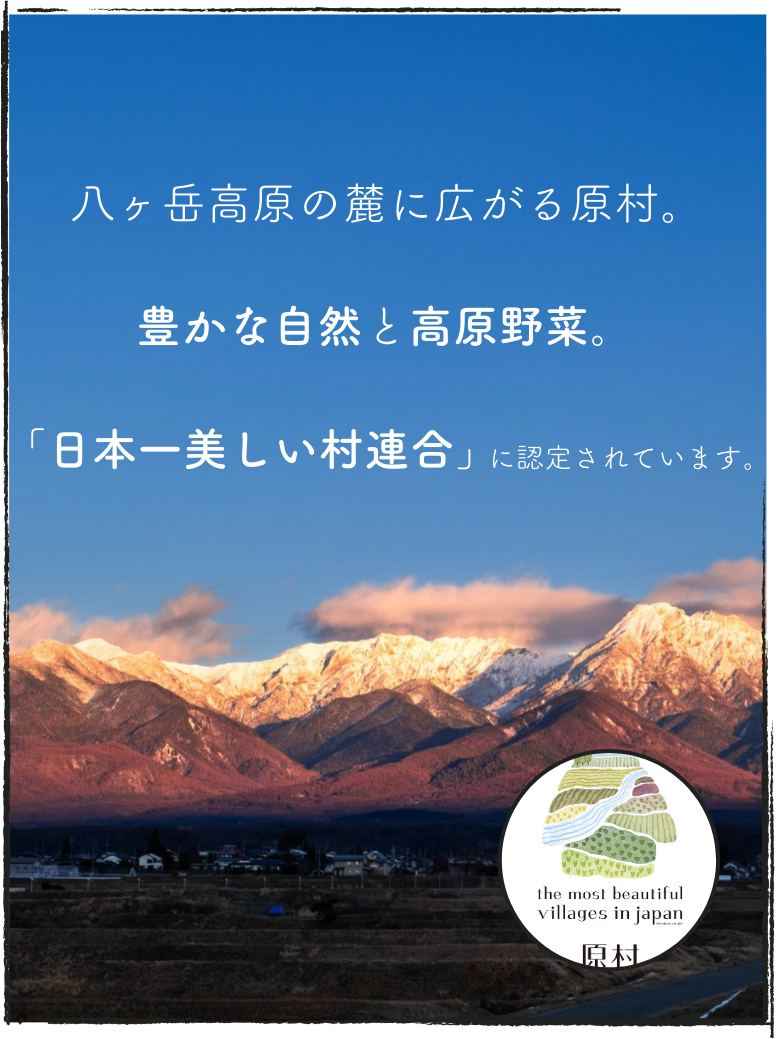 原村は、八ヶ岳の裾野のなだらかな傾斜地に広がる高原の村です。山や谷は少なく、村内からは東に八ヶ岳連峰の雄大な景観を望めるほか、北には蓼科山、北西には北アルプス、西には諏訪湖や入笠山、南には南アルプスや富士山も見渡せる 360 度のパノラマが広がっており、「日本一美しい村連合」にも認定されています。また、数千年を遡る縄文時代の黒曜石鉱山があり、「星降る中部高地の縄文世界」として文化庁の日本文化遺産に指定されています。