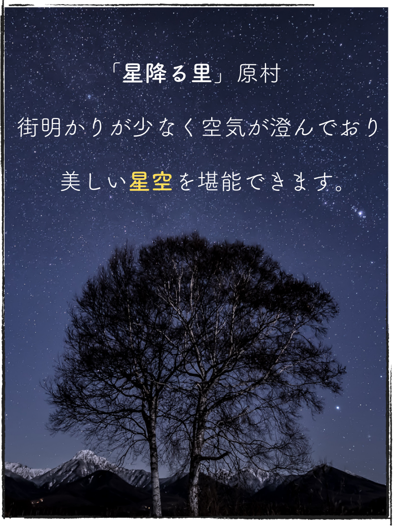 昼夜の気温差が大きく晴天率が高いことや、900-1300mに及ぶ標高、湿度が低いなどの恵まれた環境から、夜には美しい星空が立ちならび、縄文から続く星降る里の姿が現れます。