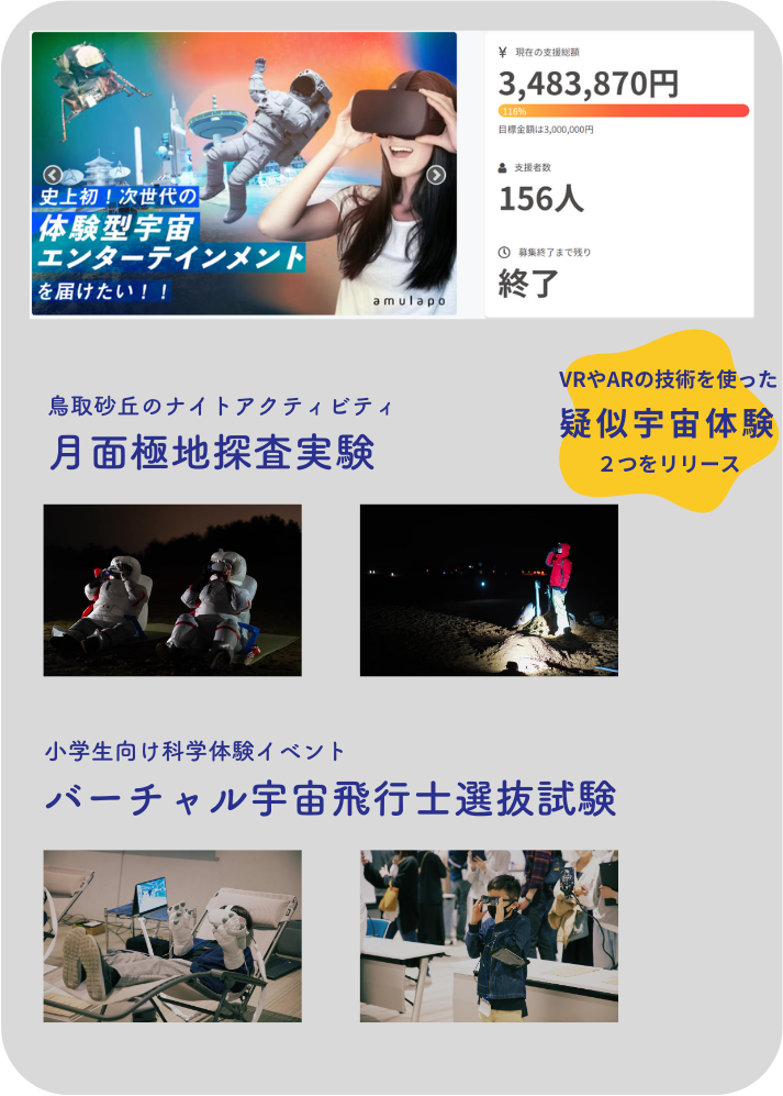今回、宇宙体験を造成するamulapo(アミュラポ)は、これまでAR/VR等のデジタル技術を用いた宇宙疑似体験のコンテンツを造成してきました。2021年のクラウドファンディングでは、150名以上の方にご支援をいただき、目標金額となる300万円を達成いたしました。おかげさまで、月面極地探査実験A、バーチャル宇宙飛行士選抜試験のサービスリリースを行うことができました!