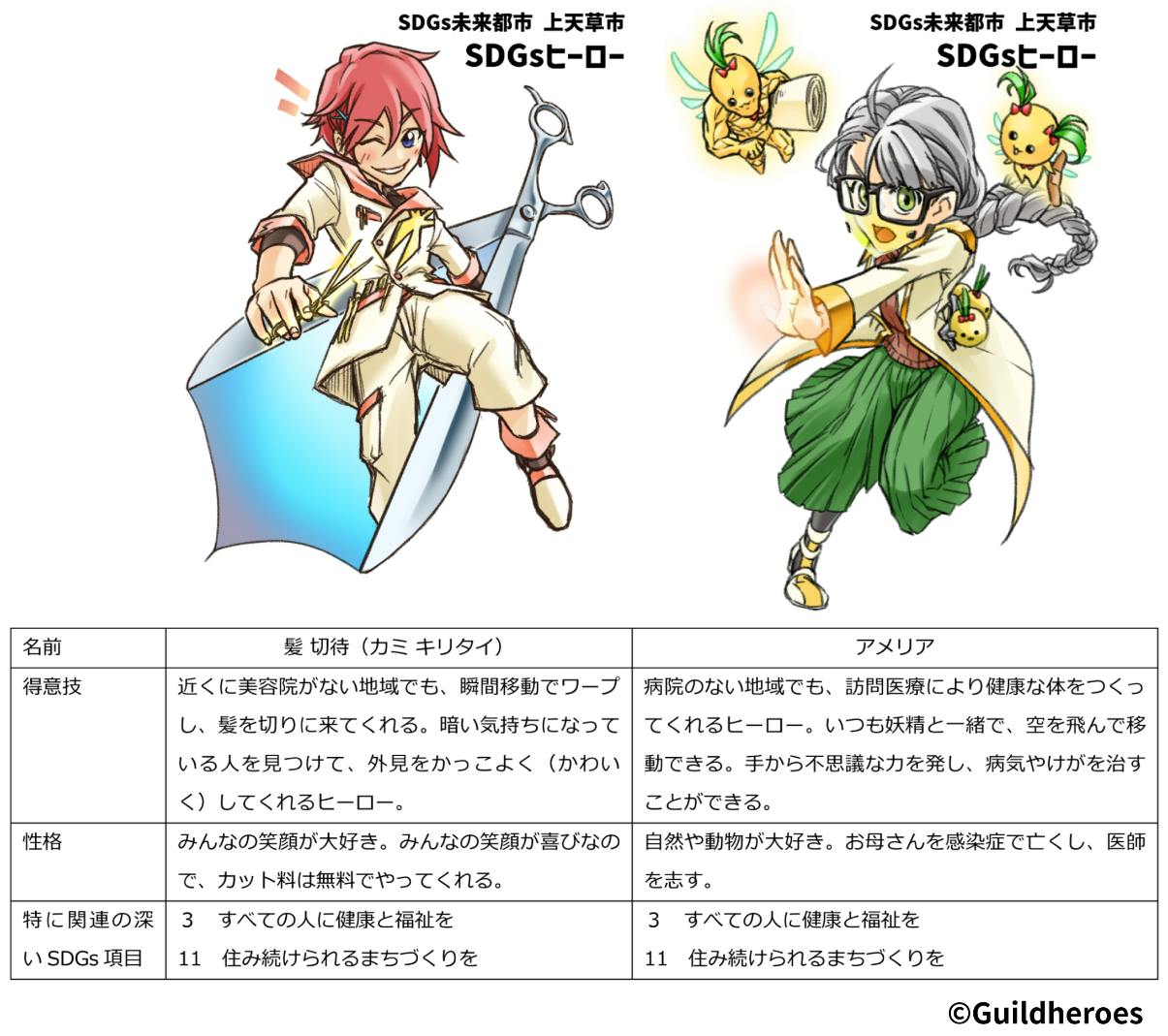 このプログラムでは、県立上天草高校の高校生たちがSDGsや地元の社会問題について学びながら、私たちの持つトレーディングカード(トレカ)「ギルドヒーローズ」で培ったノウハウを活かし、一緒に実際のキャラクター制作(ストーリーメイク・絵コンテ制作など)を行い、2人の「SGDsヒーロー」を生み出しました!