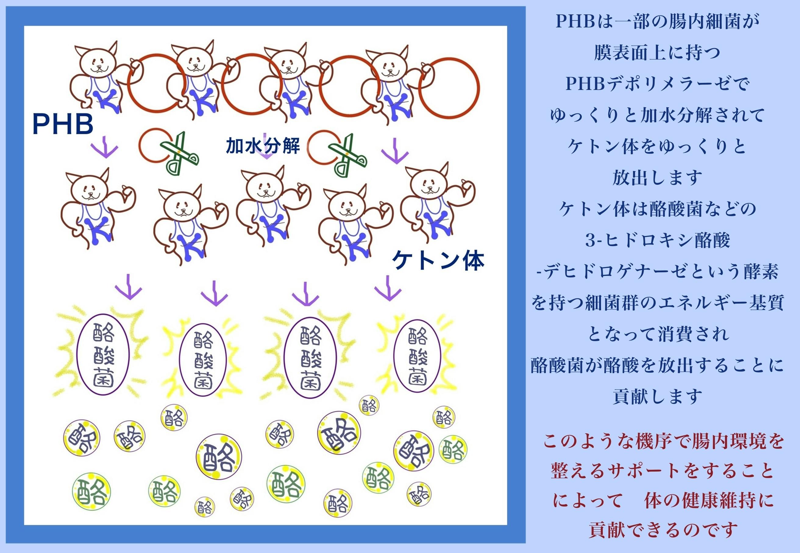 ケトン体のポリエステルであるPHBは、『腸内細菌叢に届くと腸内細菌の酵素により加水分解され、ゆっくりとケトン体を放出し、酪酸菌を活性化して酪酸の放出を促す』という新しいプレバイオティクスを説明した画像。