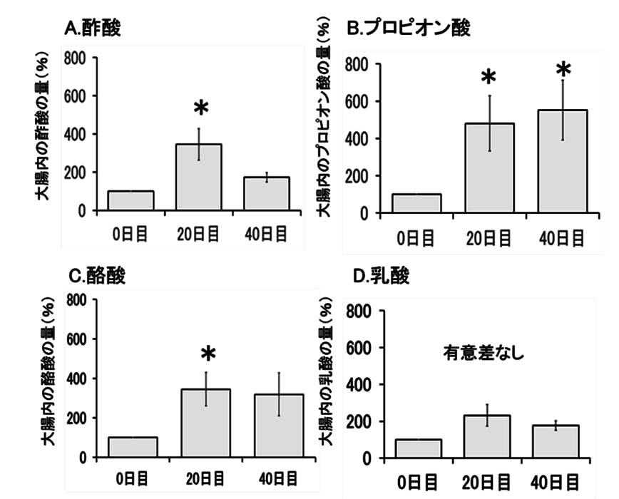 生後90日齢のマイクロミニブタに2%のPHBを40日間混餌で与え、糞便中の酢酸、プロピオン酸、酪酸及び乳酸の濃度を液体クロマトグラフィーを用いて測定したところ、酢酸、プロピオン酸及び酪酸(いずれも短鎖脂肪酸)の濃度が高く維持されました。またpHは低く維持されました。