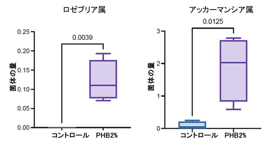 2.本年(2023年)7月には、ケトン供与体/PHBにより肥満マウスの中性脂肪を低く維持したという論文が発表され、酪酸菌であるロゼブリア属と共にアッカーマンシア属(いわゆる痩せ菌/アッカーマンシア・ムシニフィラ Akkermansia muciniphila )が高い状態で維持される可能性が明らかにされました。