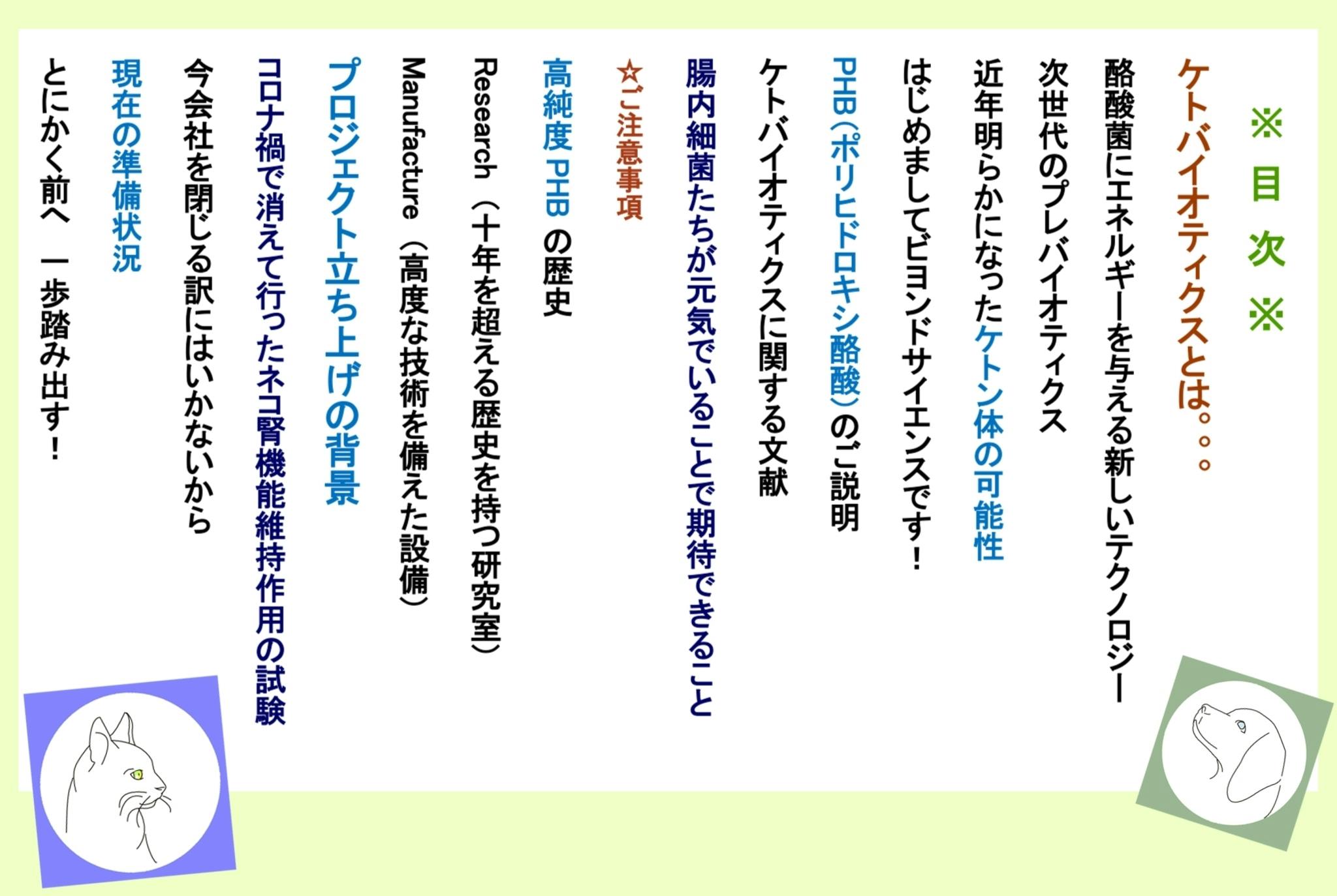 そこで今年8月には研究者(佐藤拓己氏)独自で研究費を当て、また企業からの支援も得て、まずは某医科大学で、マウスでのPHBによる腎機能維持に対する作用の試験の準備がすでに開始されました。その試験が終わればすぐにでも、CKDを患った猫ちゃんたちにPHBを食べてもらう臨床試験に取り掛かりたいとの希望を持っています。