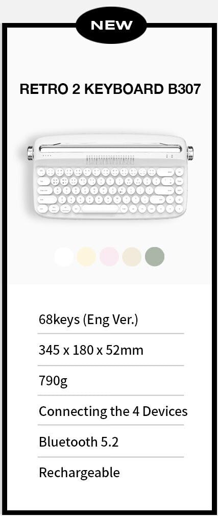 複数の機器を接続できるマルチペアリング、絵文字キーを追加し2種類のカラーキーキャップを付属しています。レトロなデザイン感に加えた最新機能はタイピングをより楽しくしてくれます。物足りなかったモバイル生活をよりシンプルで豊富にしてくれるでしょう。