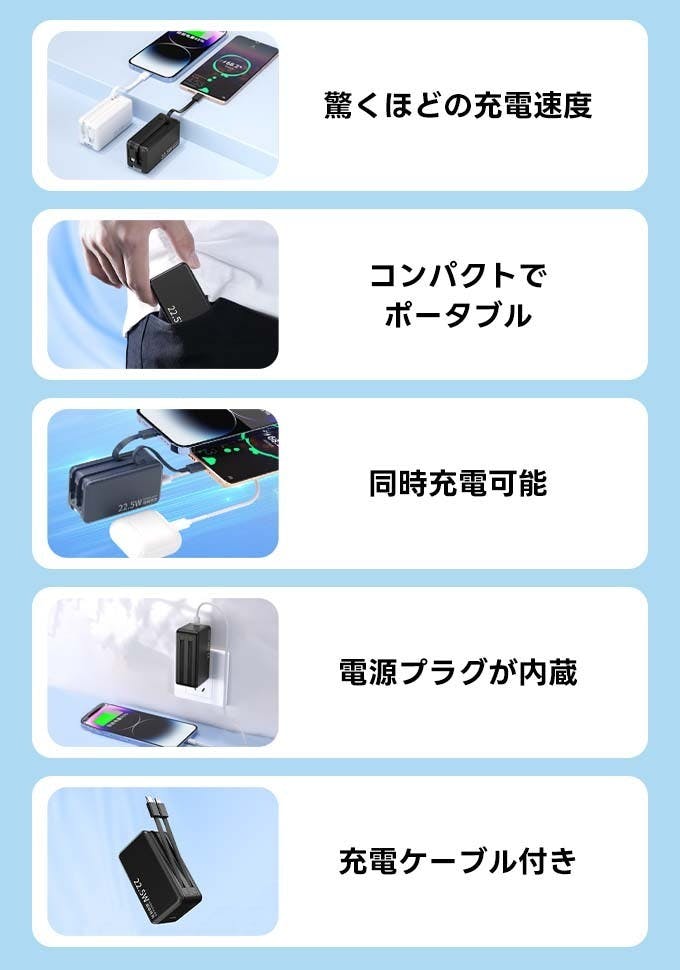 本製品は、充電器、モバイルバッテリー、ケーブルの機能を一つにまとめた便利なアイテムです。コンセント対応なので、電池残量が少なくなっても安心です。さらに、Lightning&Type-Cケーブルが付属しているため、別にケーブルを用意する必要はありません。忙しい現代人や旅行好きの方にとって、必須のアイテムとなることでしょう。