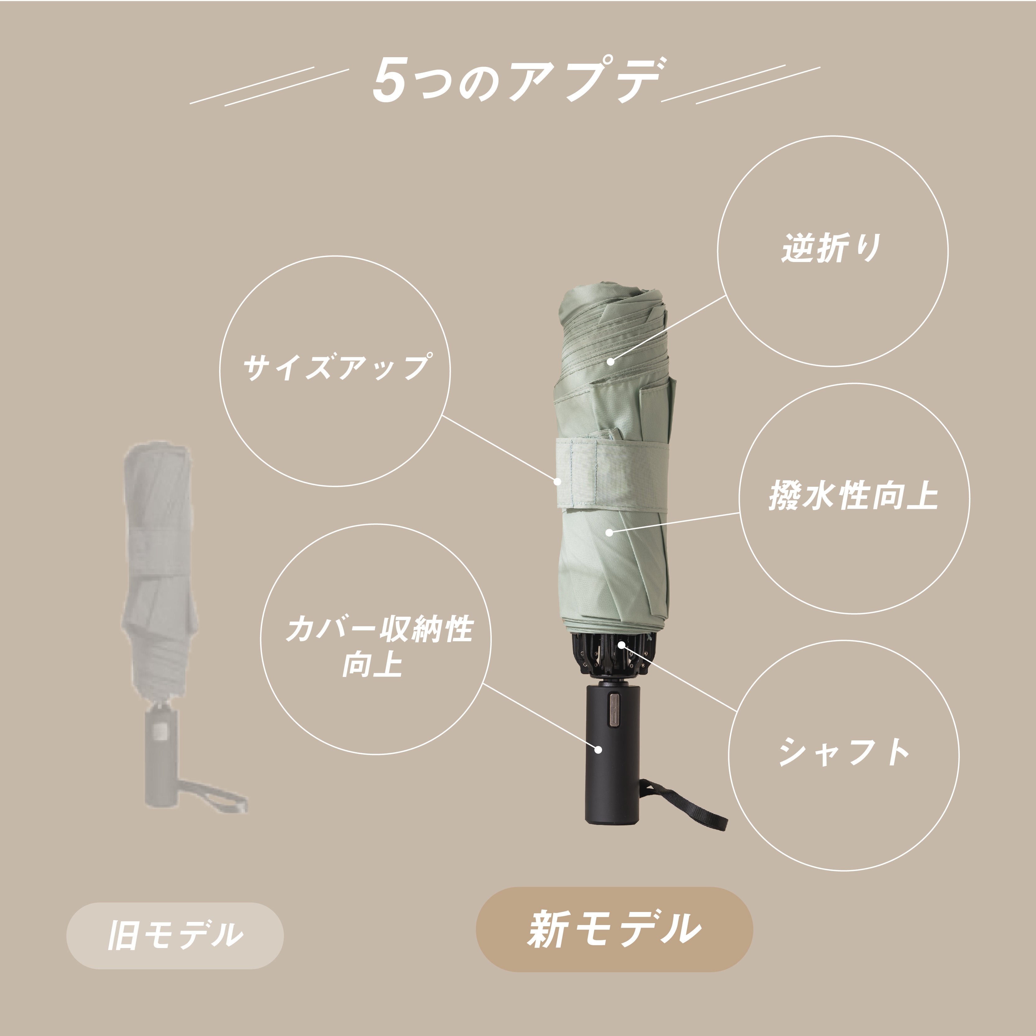 ROLLSは創業以来、上記のようなお客様の声をもとに改良を繰り返してきました。お客様から反響が大きい機能・性能はそのままに、ご意見をいただいたところを積極的に変えていくというスタイルを繰り返していく中で、今回の『逆折り傘、ROLLS REVERSE(ロールスリバース)』では以下のような部分のアップデートを実施しました。