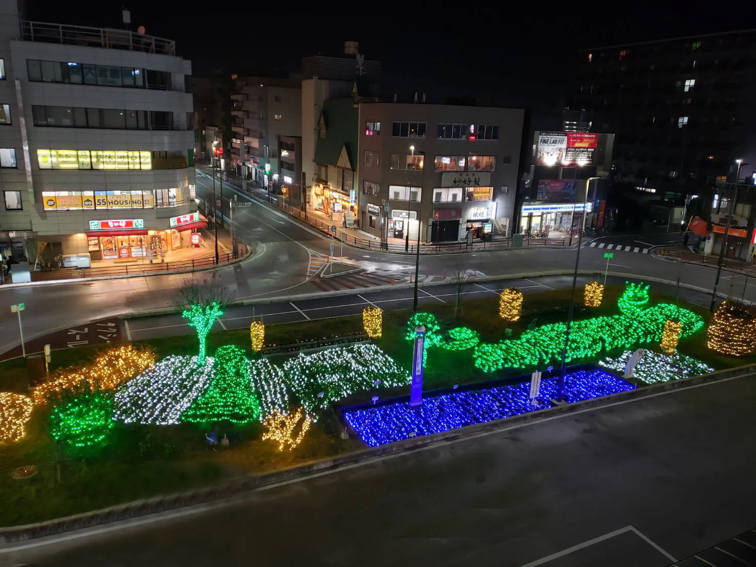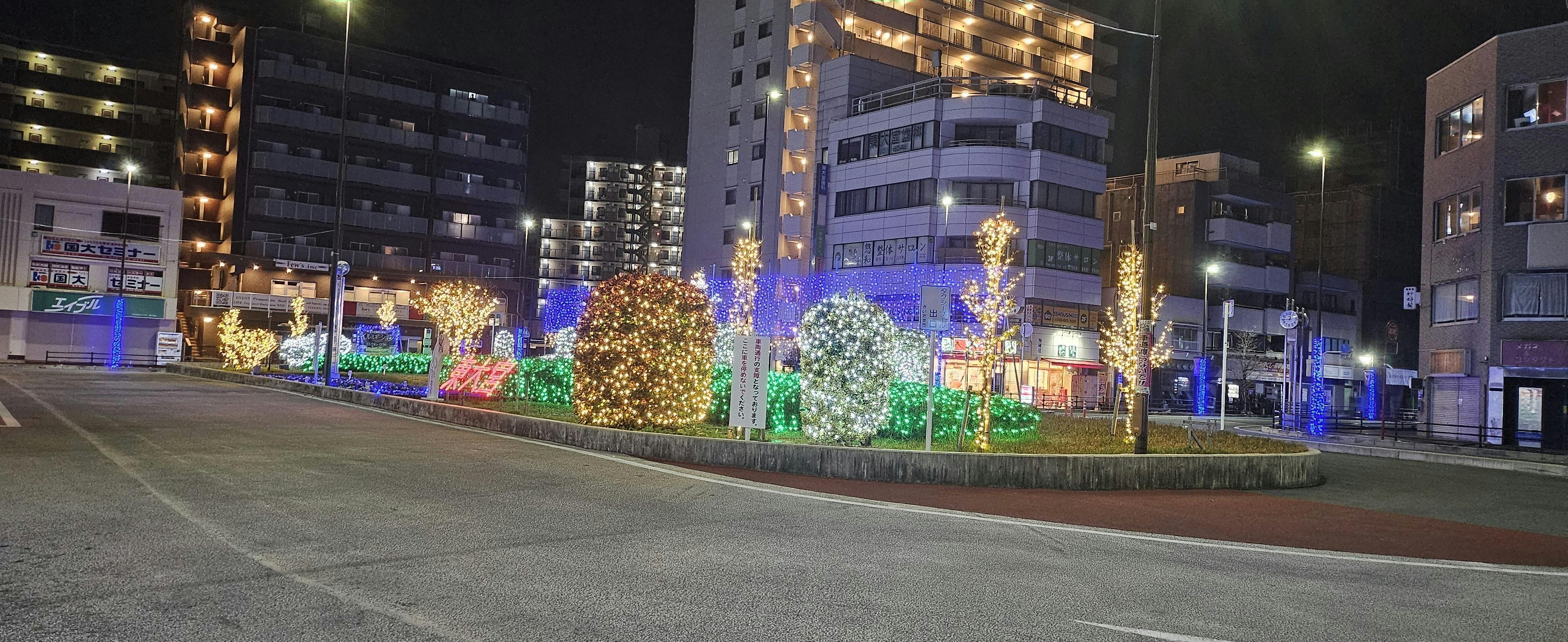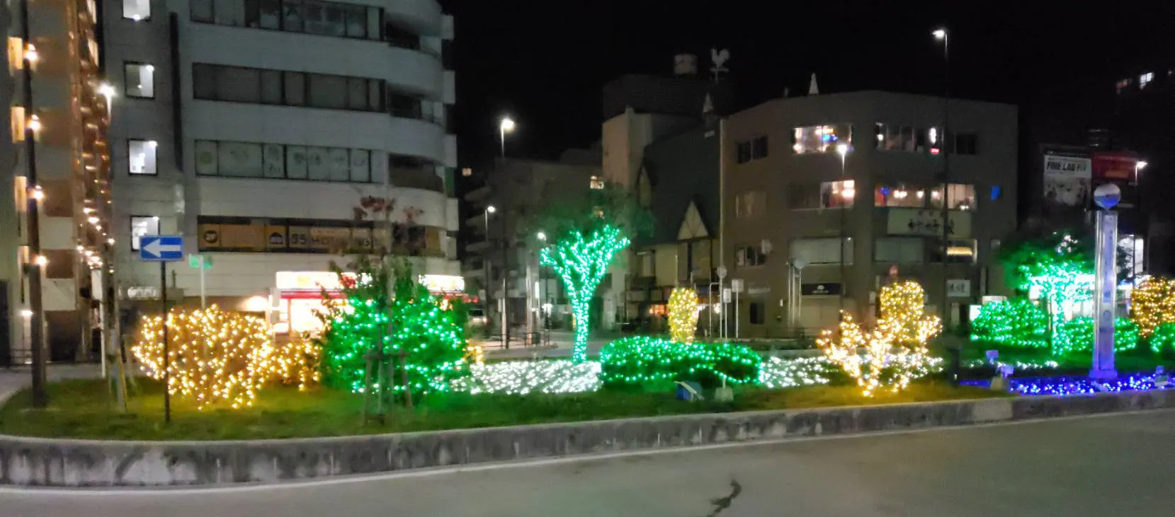 そこで、昨年、西口駅前のロータリー(植栽部)にLED電球で装飾し夜間ライトアップのイルミネーションを行いました。