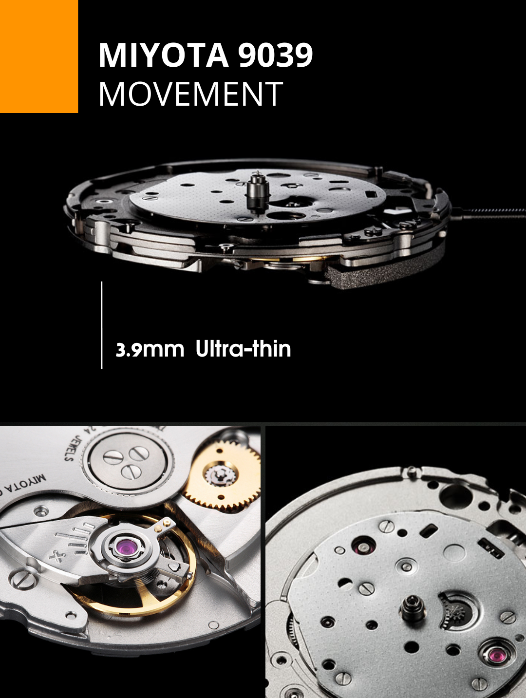ムーブメントには、日本製であるミヨタのCal.9039自動巻きモデルを搭載しました。