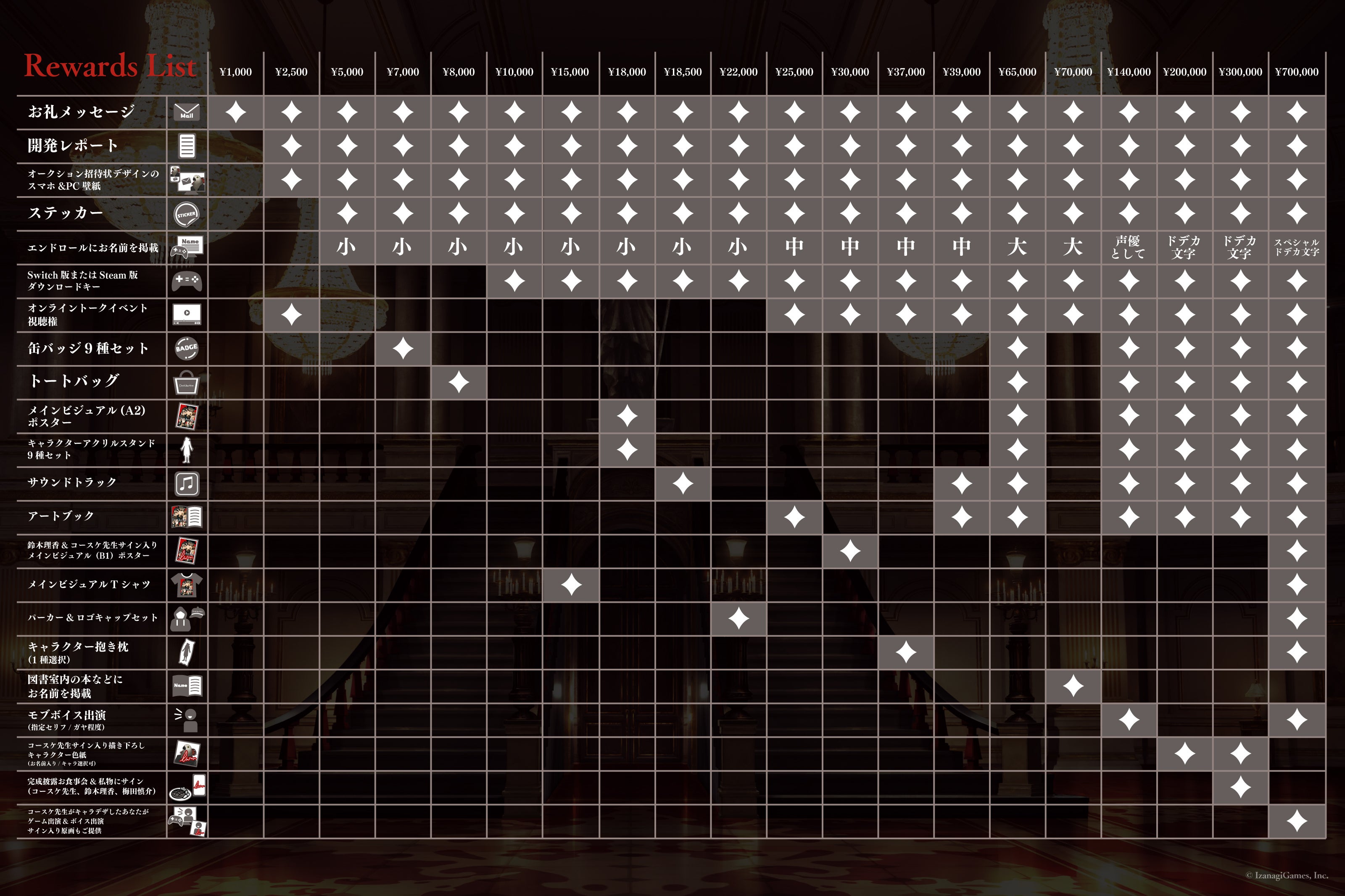 初めまして、イザナギゲームズでございます。この度、鈴木理香(『アナザーコード 』『ウィッシュルーム』) が原作・シナリオを、コースケ(マンガ『GANGSTA.』)がキャラクターデザインを担当する、新作「本格ミステリーアドベンチャーゲーム」の開発に伴いみなさまのご支援を賜りたく思っております。共同開発者となって一緒にゲームプロジェクトを盛り上げていただければ幸いです。