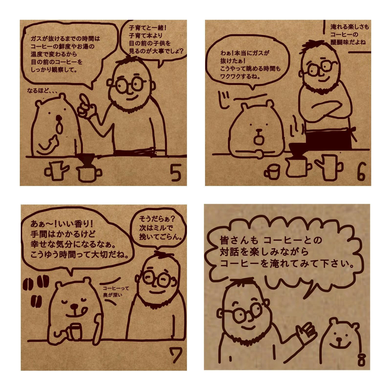 「他のコーヒーには無い付加価値を、誰かが代わりに伝えなければ!」そんな想いに突き動かされるように、私はオンラインショップのページを作り替え、活動報告を兼ねたマンスリーレターとブログの執筆も開始しました。そんな折、「コーヒーのドリップは子育てと一緒。育児本を見るより、目の前の子供を見るのが大事でしょ。」という池島さんの何気ない一言に、「うまいこと言うな!」と思い、面白半分で描いたのが漫画の第一話です。池島さんは、いつもの口癖、「スーパー素敵じゃん!」を連発して気に入って下さり、そのまま公式インスタグラムに投稿。ありがたいことに好評を得て、そのまま漫画連載を不定期で続けていくことになり、今に至ります。