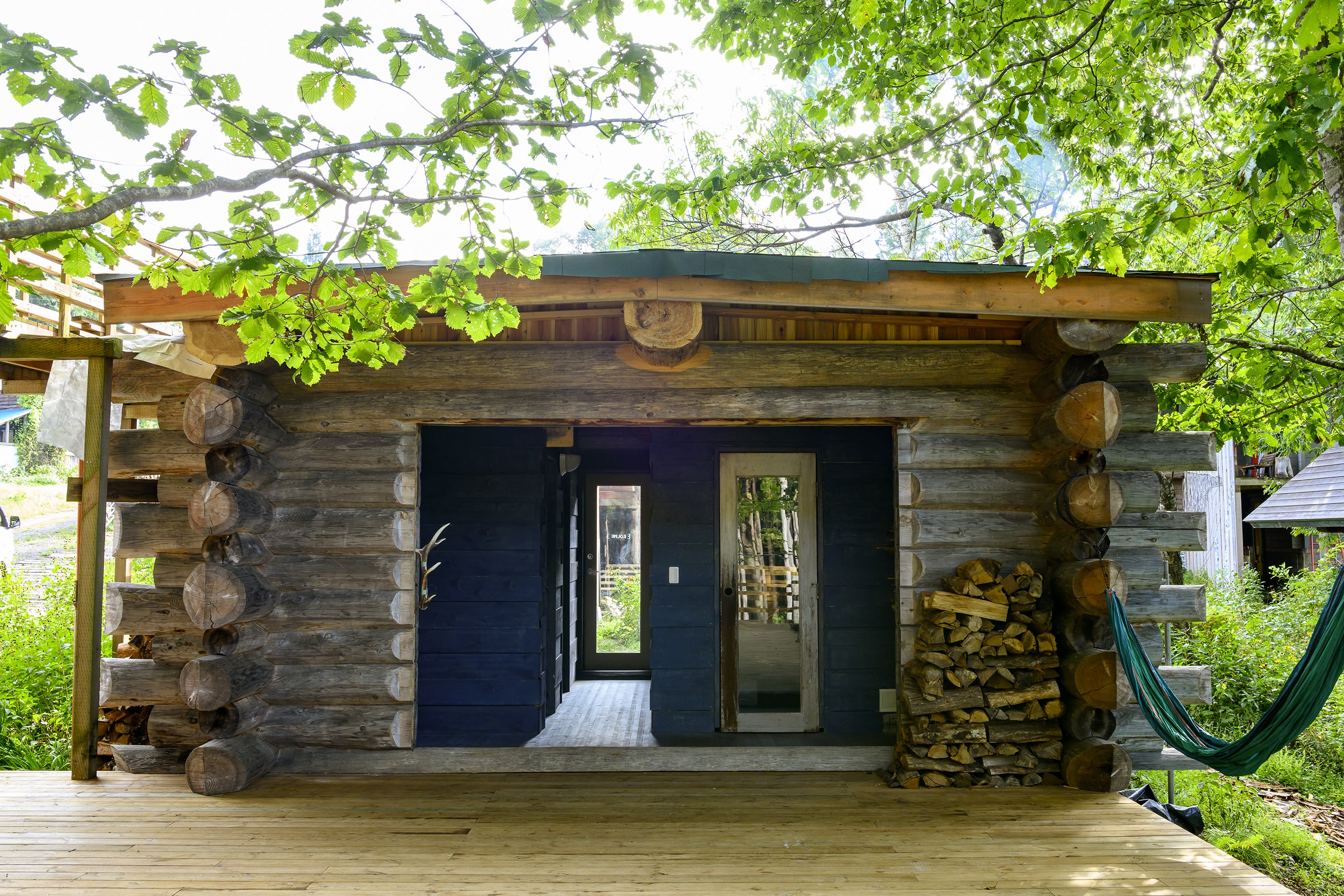サウナ後に宿泊→翌朝森の中で目覚めて朝サウナ、というコースができるよう、1棟貸しのログハウス しぇろくま's DEN(巣穴) があります。外気浴中にウッドデッキで しぇろくまCafe の食事をしたり、サウナ前後でBBQ、焚き火、といったアウトドアピクニックが気軽に楽しめます。