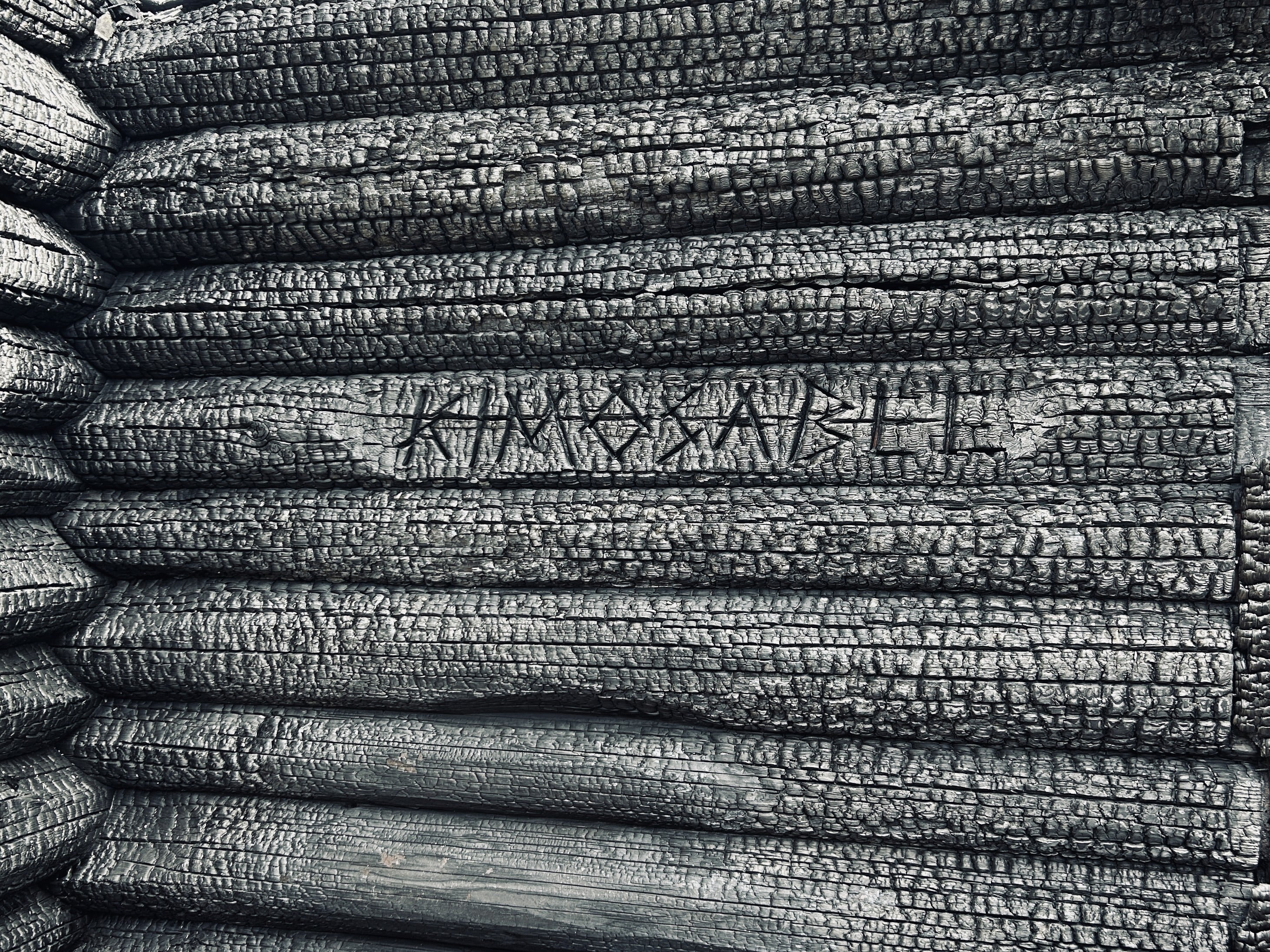 火災後、サウナに刻まれた文字が黒く浮き立っていました。"KIMOSABEE" とは "信頼のおける友人" というアメリカン・インディアンの語。気を許せる仲間たちとの楽しい時間を過ごせる場になって欲しいという想いを込めてつけられたものです。火災が起こる前までは、言葉の通りの場となっていました。