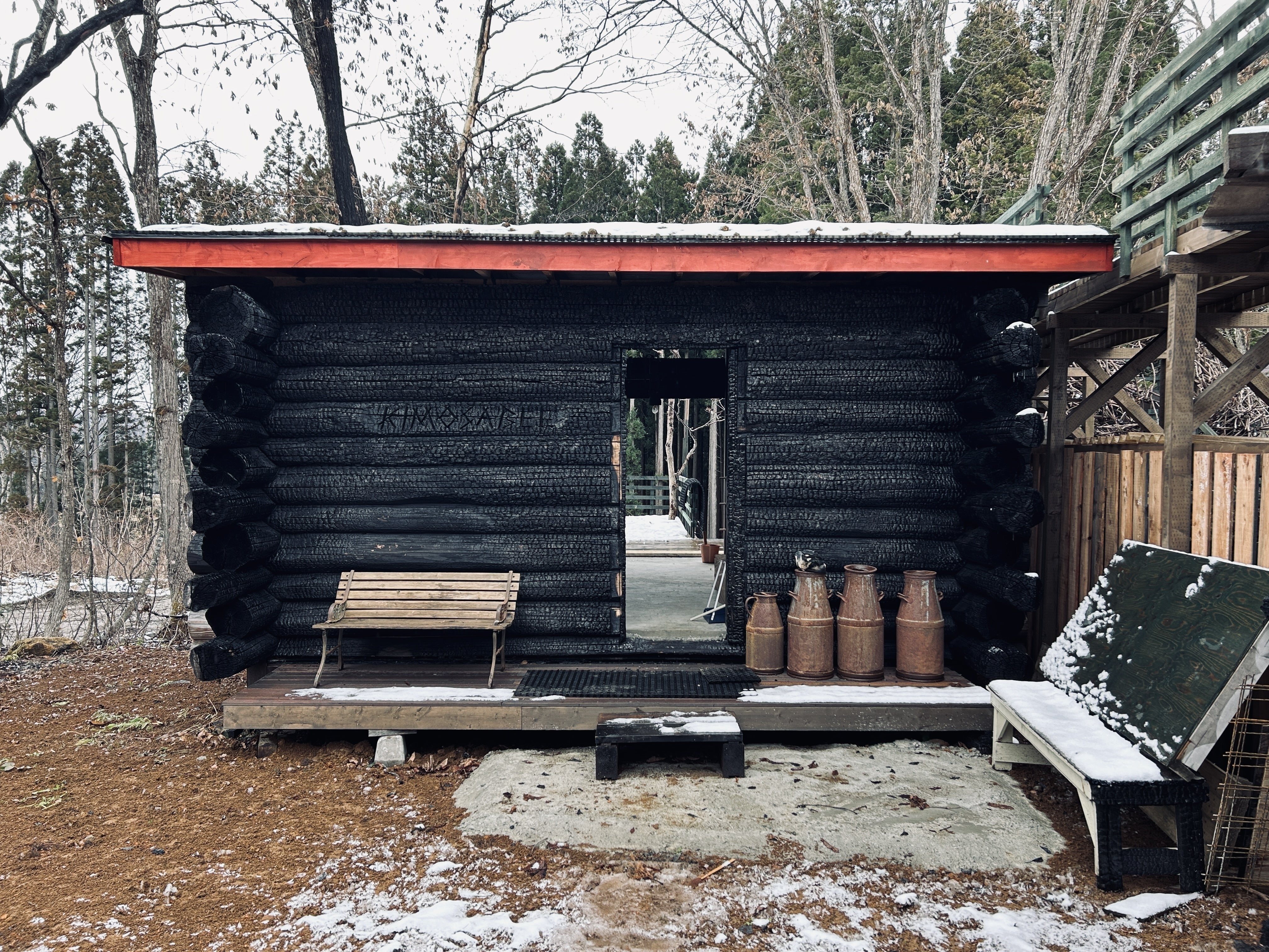 2023/12/03 11:16床はコンクリートを打ち、雨や雪の日に屋根の下で外気浴できるようになりました。薪置き場としても利用しています。納屋の雰囲気。触ると炭化した表面が崩れるためフェンスで囲いました。これからのシーズン、雪で辺りが真っ白になった時、黒いログが映えるだろうな、と楽しみにしています。 もっと見る