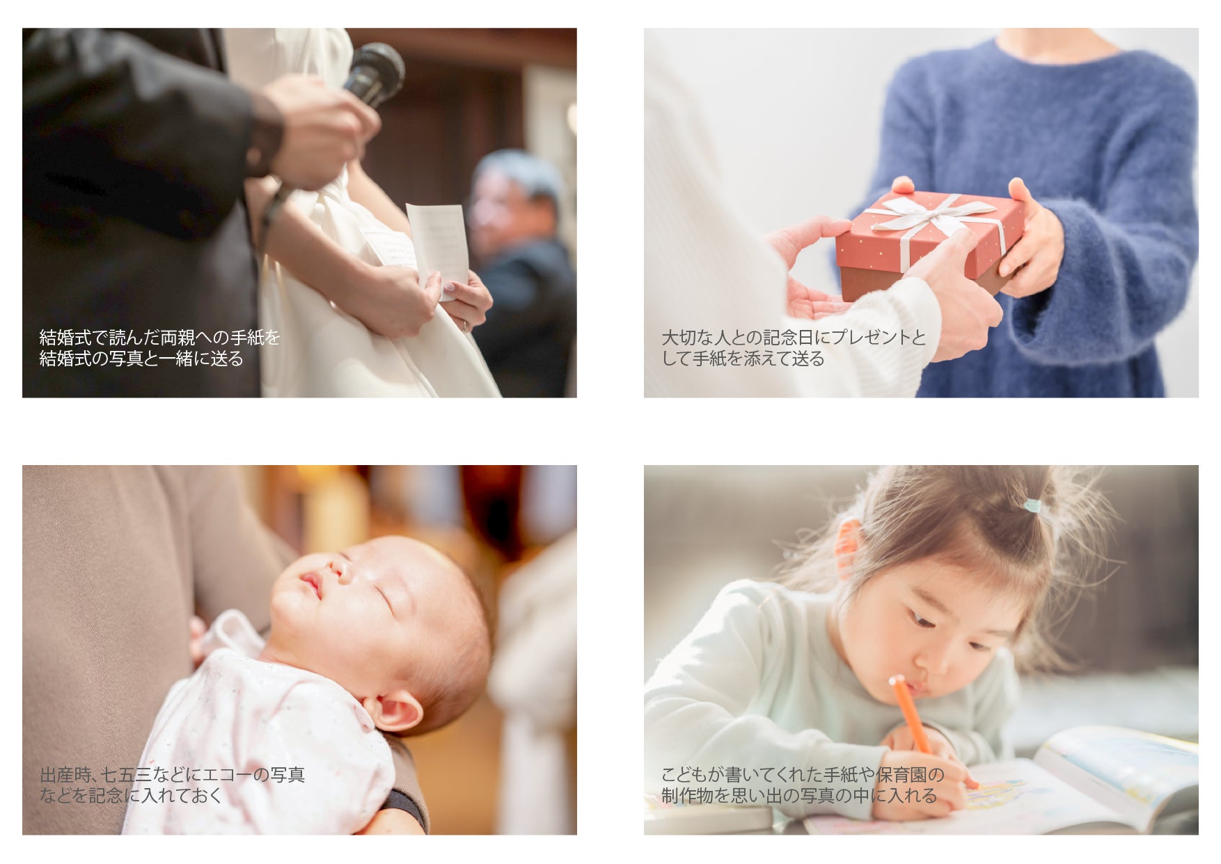 結婚式で、両親に書いた手紙を、自分の小さい頃の家族写真と一緒にプレゼントとして提供したら、どれほど両親が感動するか。