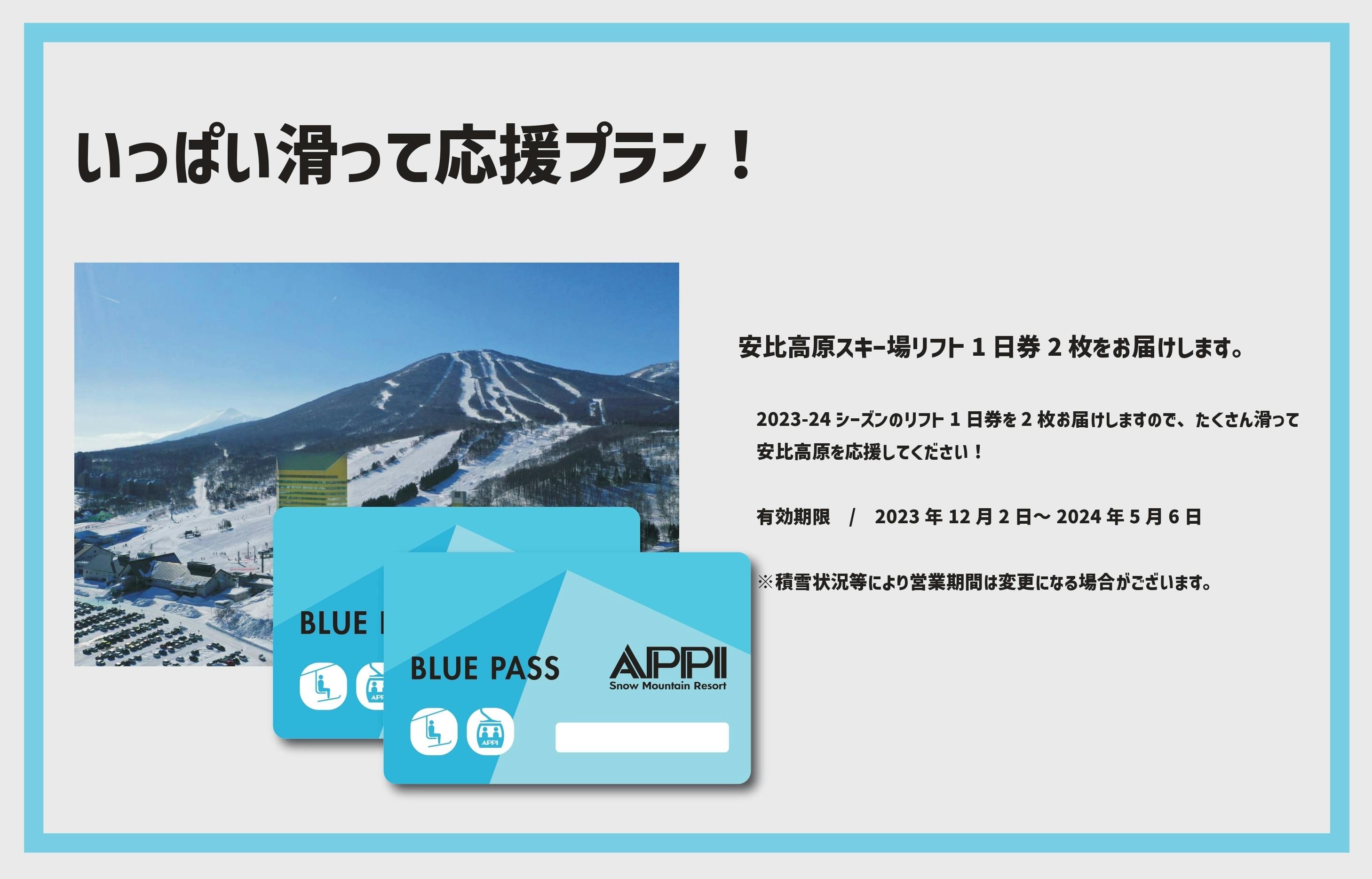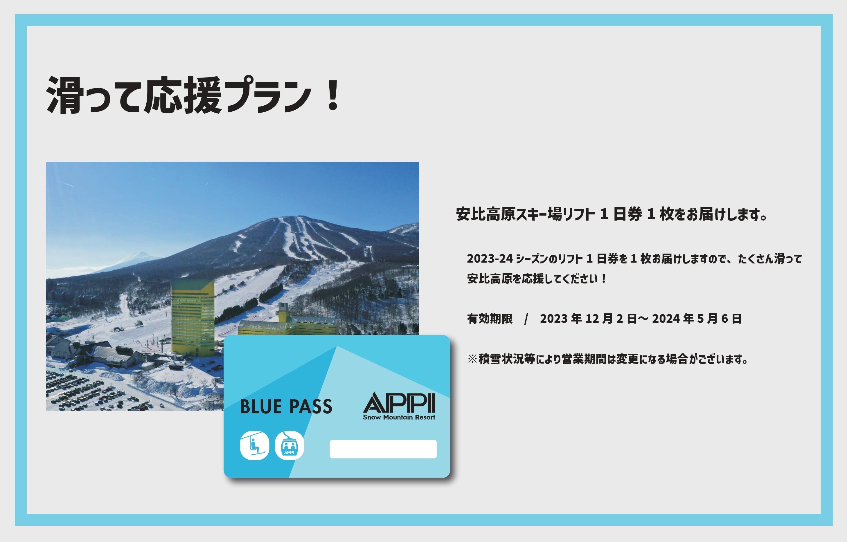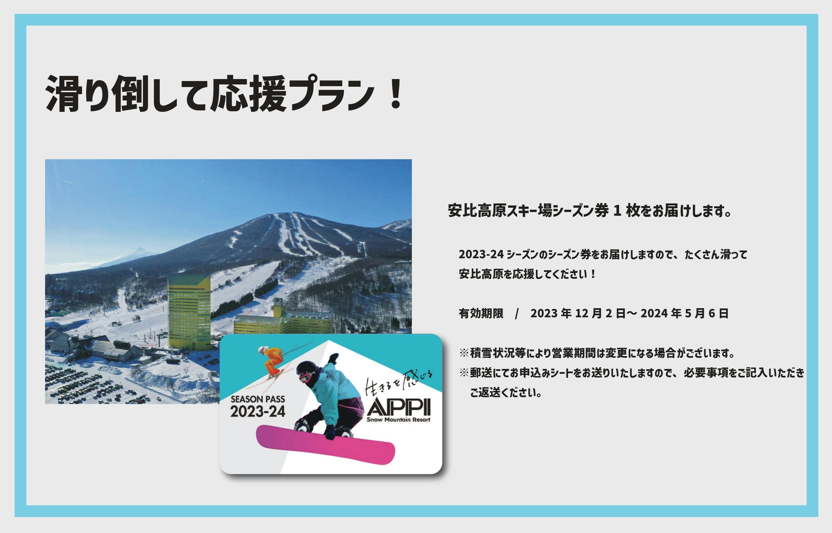 ※滑って応援プラン・いっぱい滑って応援プランの”リターンを選ぶ”の詳細にシーズン券と記載がありますが、正しくは「リフト1日券」となります。