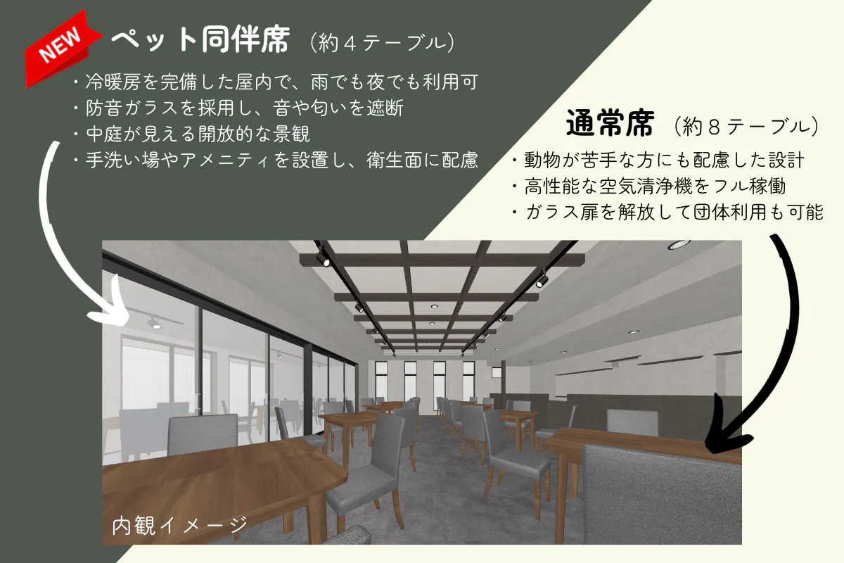 ◆ 屋内の4テーブルをペット同伴席とし、全天候で利用可能とする