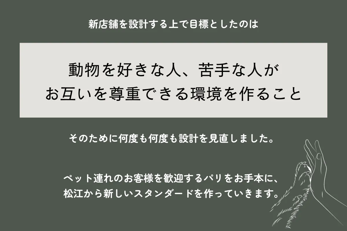 そこから長い間、ペットと一緒に楽しめる環境を提供できないか検討した結果、ペット同伴席を設けた新店舗を新築することを決断しました。