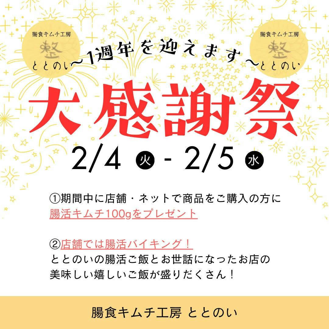2025/01/22 17:02ご無沙汰しております。腸食キムチ工房ととのいの西村さつきです。クラウドファンディングから1年。たくさんのお客様にご利用いただき、仲間やご近所さんのサポートにより無事に1年を迎えられることを心から感謝しています。そこで感謝の気持ちを込めて、一周年感謝祭を開催いたします!!ご支援いただいた皆様にも、ぜひご利用いただけると嬉しいです。____________________________________________________________2月4日・5日限定①店舗では腸活バイキングを開催(11:00~15:00)②ネット販売・店頭では商品をご購入のお客様に腸活キムチ100gをプレゼント____________________________________________________________2日間限定となります!そして、リターンをまだお受け取りでない方へ。①腸活キムチを店舗で受け取り②朝食券こちら使用期限はございませんが・・・たまに顔出していただけると嬉しいですん(*'ω'*)ぜひぜひお立ち寄りくださいね★ということで、ととのい1周年!皆様と作り上げたこのお店を引き続き大切にしていきます!今後ともよろしくお願い致します。腸食キムチ工房ととのい 西村さつき もっと見るオープンまであと3日