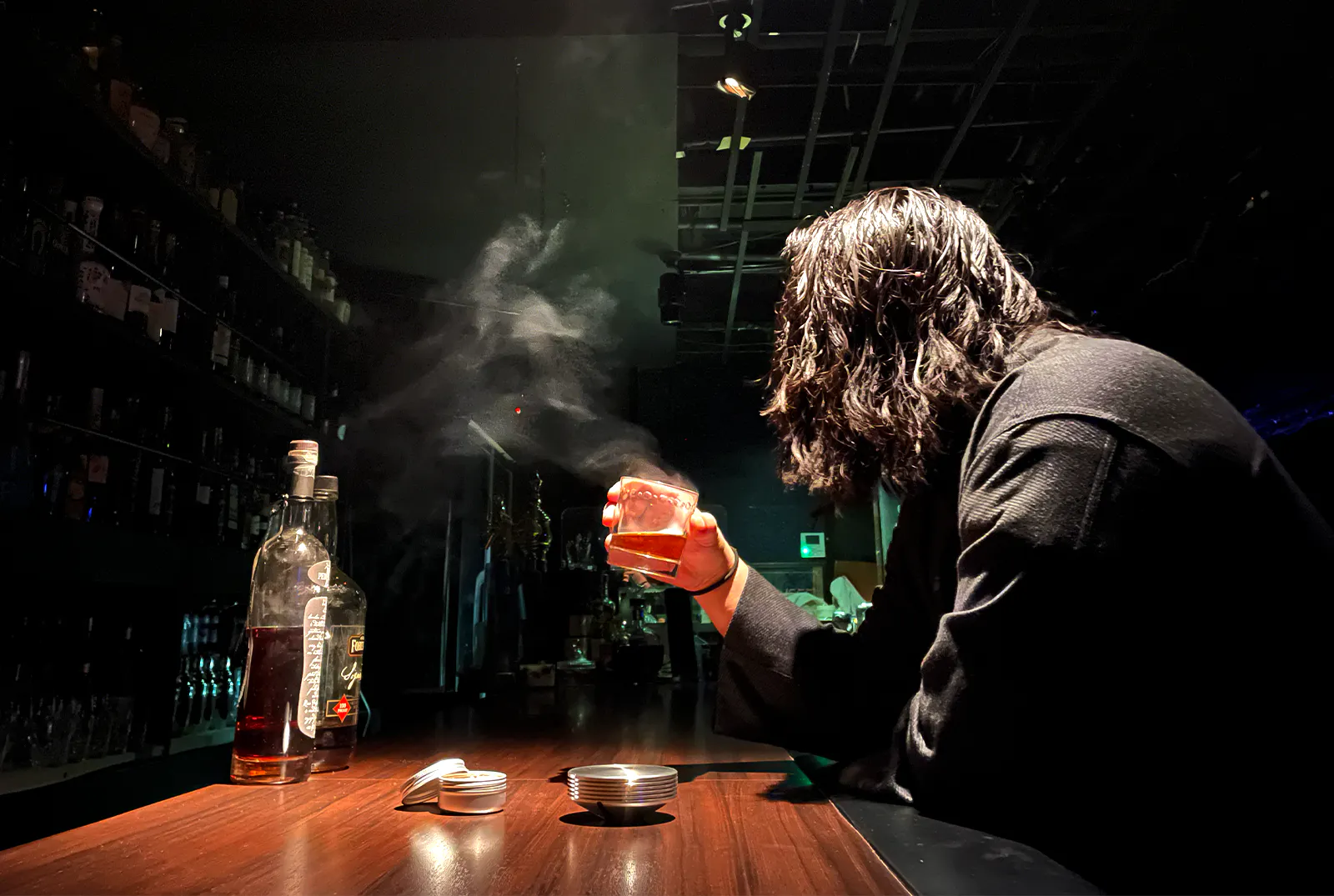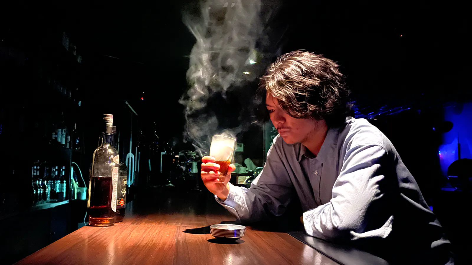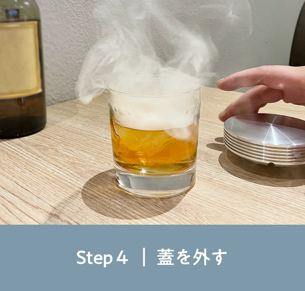ゆっくりと燻煙がお酒に降り注ぎ、お酒の燻製が始まります。