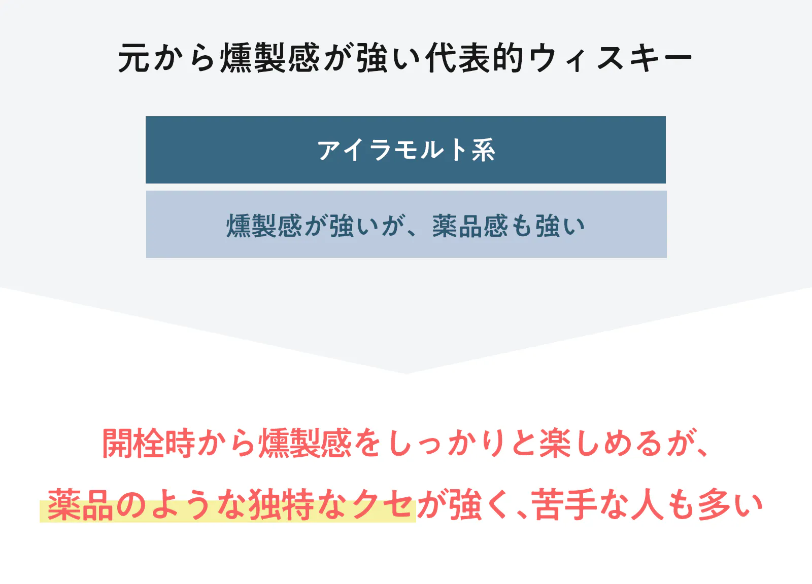 元から燻製感の強いウイスキーとして有名なアイラモルト系をご存知でしょうか。深い燻製感を楽しめる反面、ピート香に含まれる独特な「薬品感」も特徴なウイスキーです。
