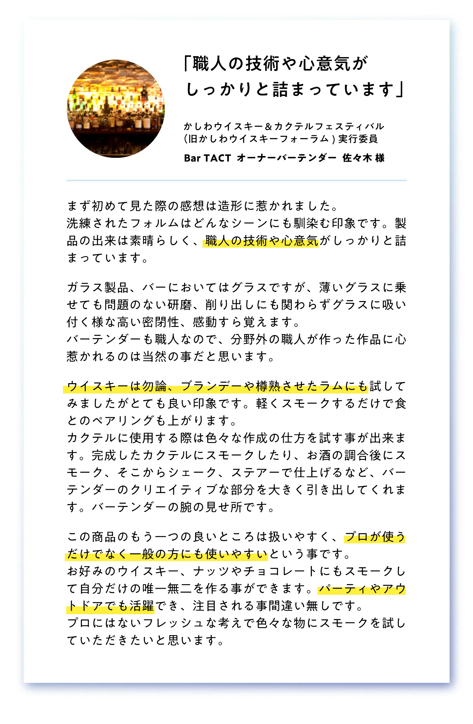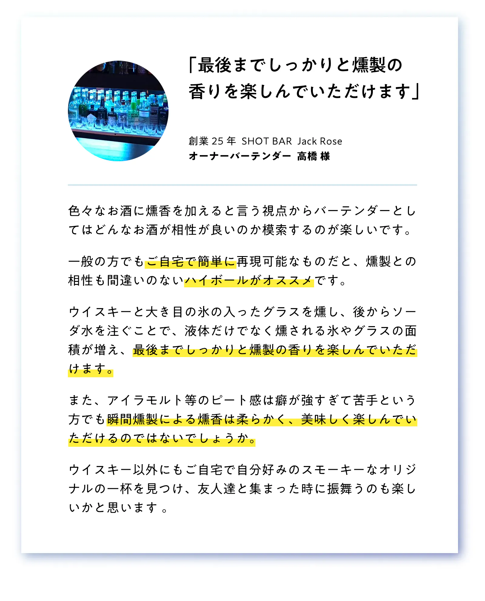 「ウイスキーの街」であり「バーの街」である柏市の会社によって開発されたsmottについて、使用感やおすすめの楽しみ方・感想など、柏市でバーを経営される2名のバーテンダー様よりコメントをいただきましたので、ご紹介させていただきます。