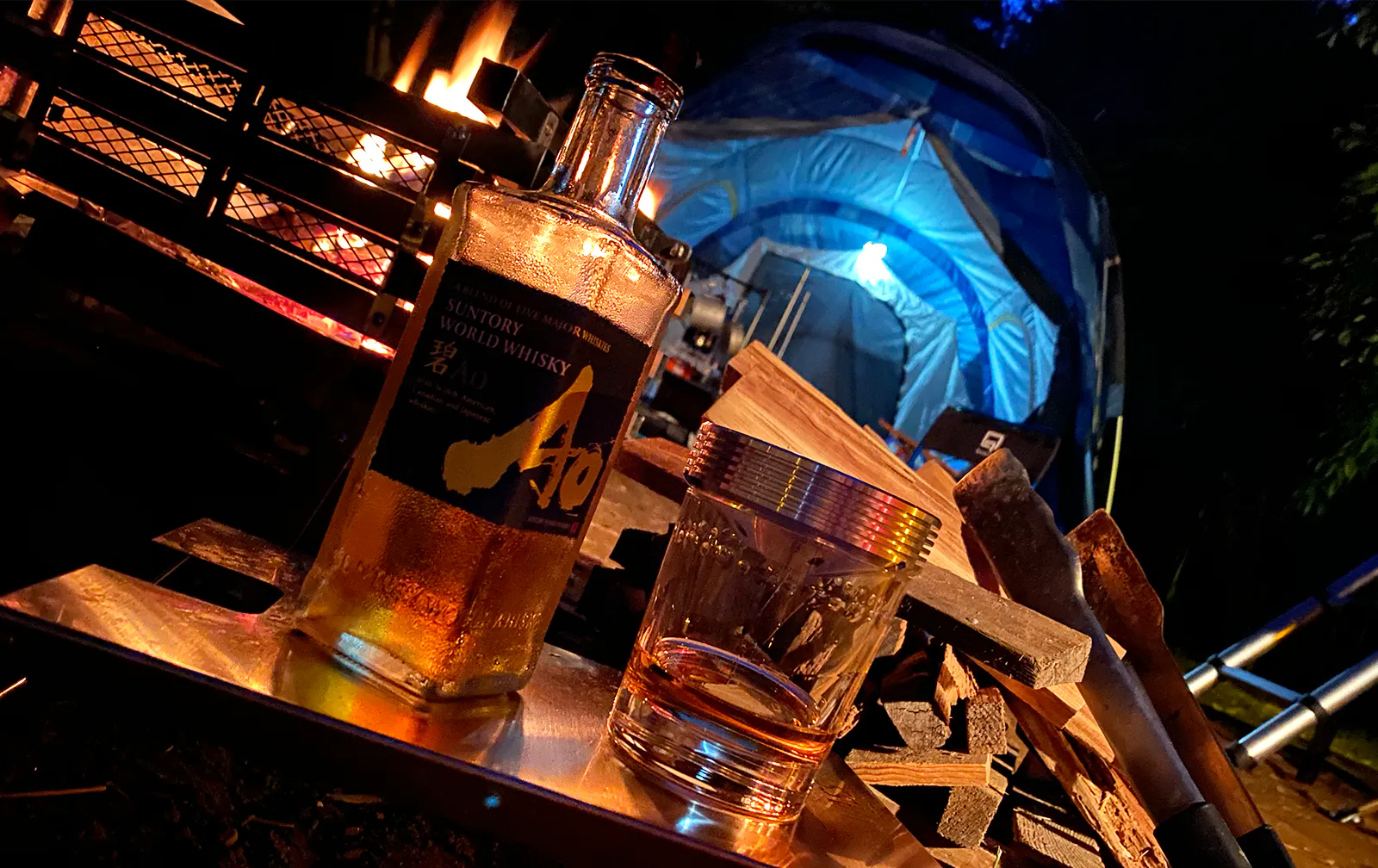 キャンプで使用する大型のバーナーで火を入れると、ほんの5秒程度でグラスに燻煙が充満します。