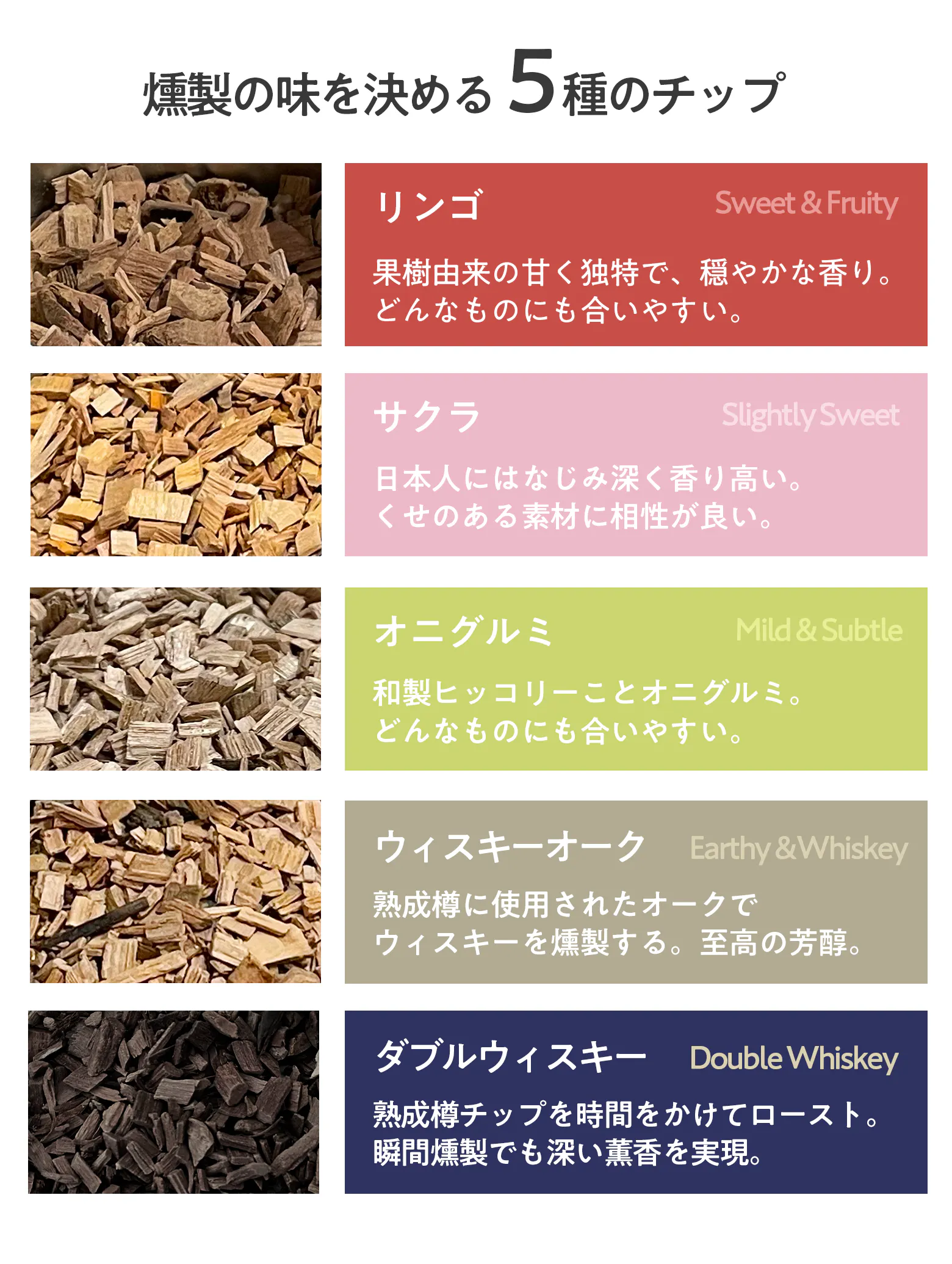使用するチップにより、燻製の味と香りが明確に変わります。好みのウッドチップを是非探してみてください。