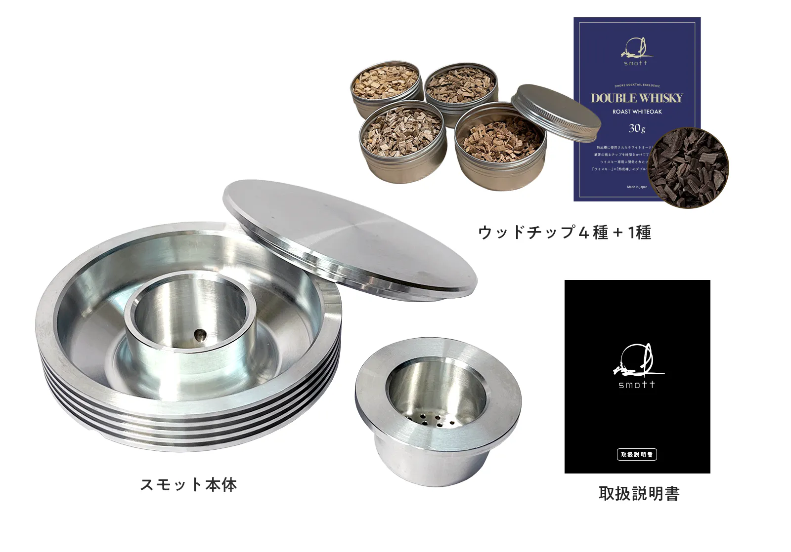 お酒とおつまみ用に適した4種類のピュアな国産ウッドチップに加え、お酒の燻製に特化したオリジナルロースト燻製チップ「DOUBLE WHISKEY」が付属します。