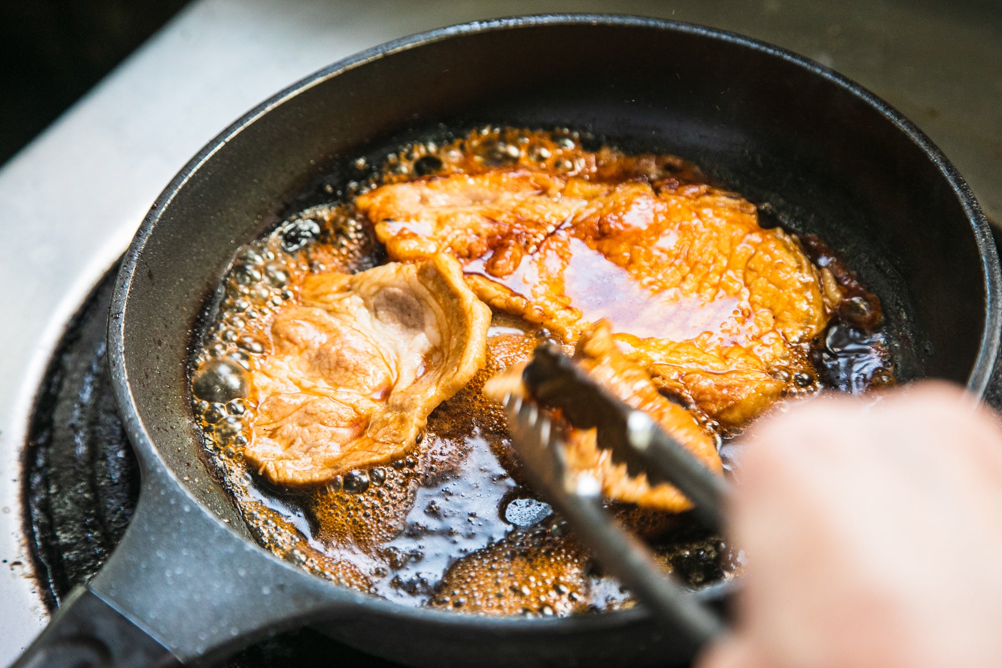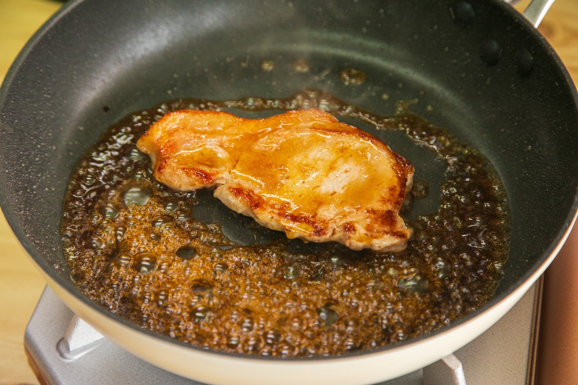 ご家庭ではフライパン一つで調理できるようにしました。豚肉にはしっかりと焼き色を付けて焼いた後、肉とタレは一度取り出します。残っているタレは洗い流さずに、そのまま同じフライパンにスープを入れます。