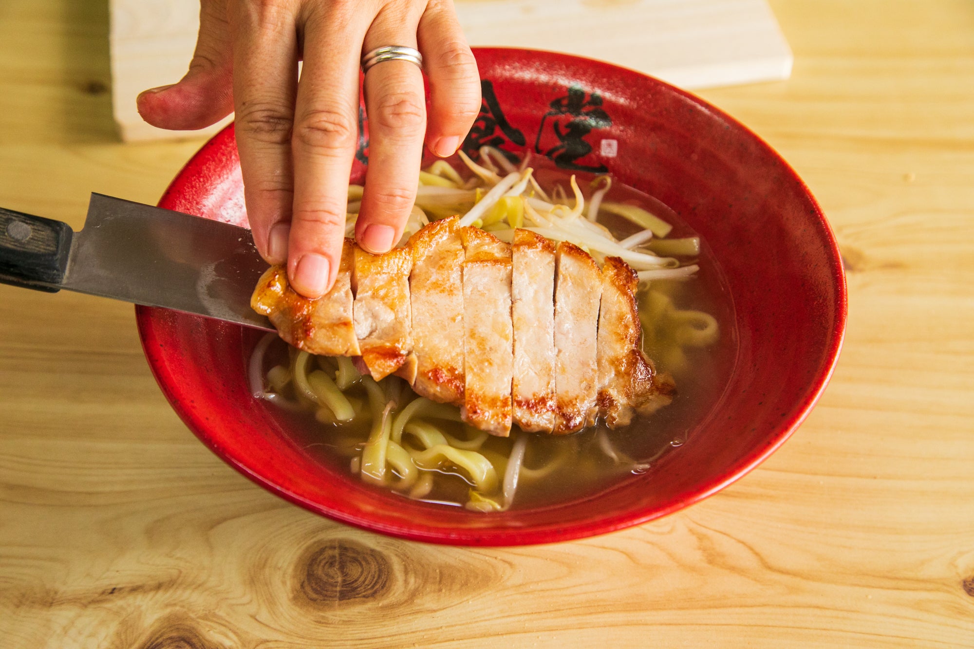 園食堂の肉タンメンには肩ロース薄切りもトッピングされていますが、この度の商品は焼きムラを防ぎ自宅で調理しやすい豚ロース肉100g1枚にしました。
