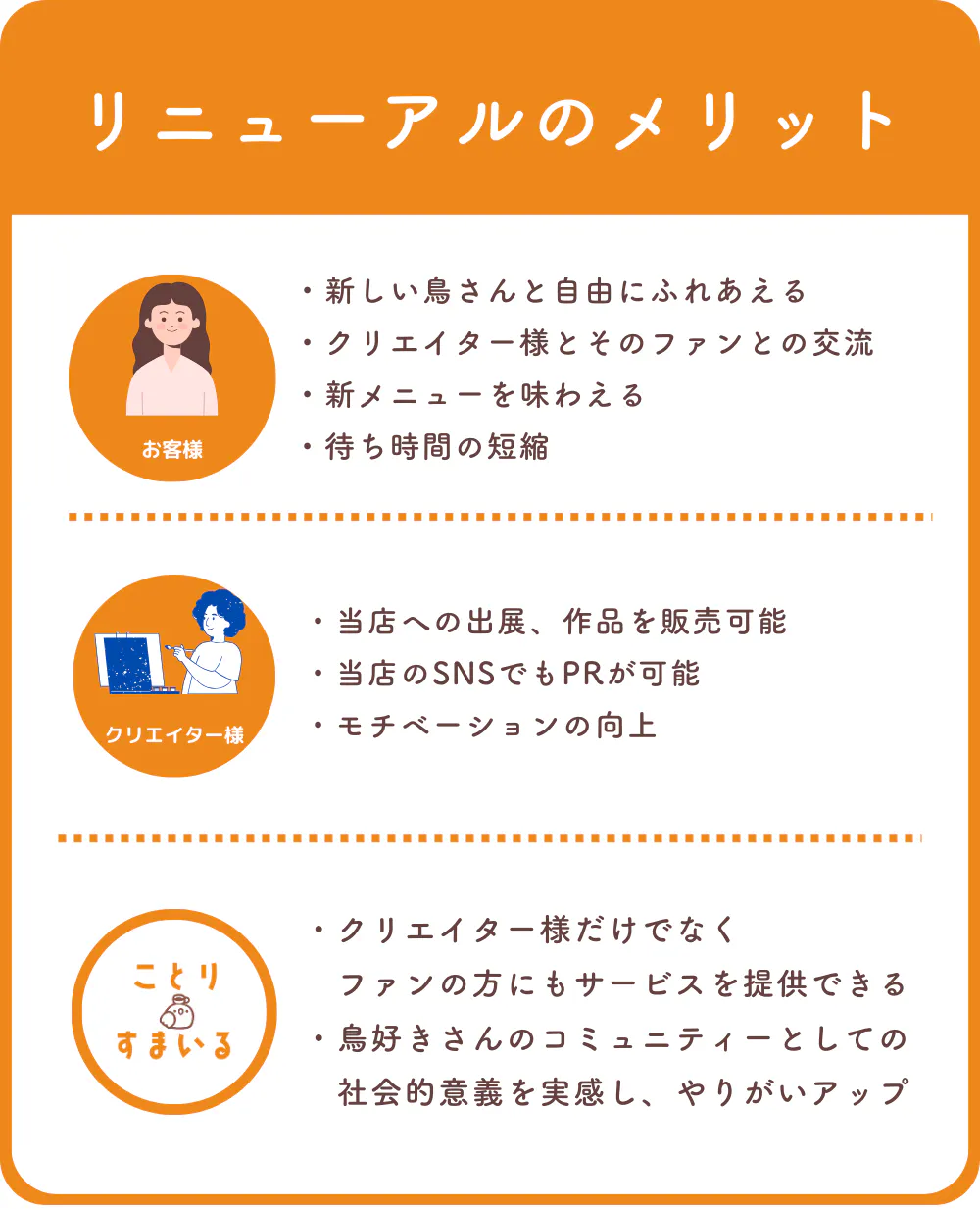 このたび、11月中旬に店舗をリニューアルオープンいたします。新しい鳥さんを迎え、新メニューの提供・クリエイター様・企業様とのコラボにより、さらにお客様に喜んでいただけるお店にしたいと思い、当プロジェクトを立ち上げました!