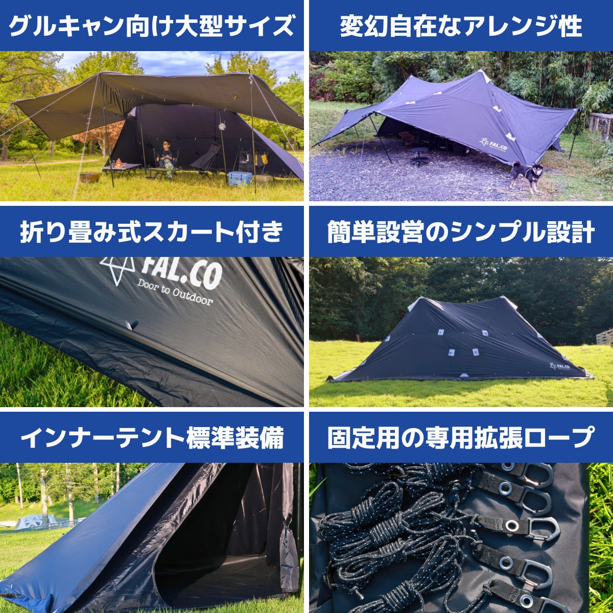 アウトドアブランド FAL.CO(ファルコ) のこだわりを詰め込んだ変幻自在の大型シェルターテントです。