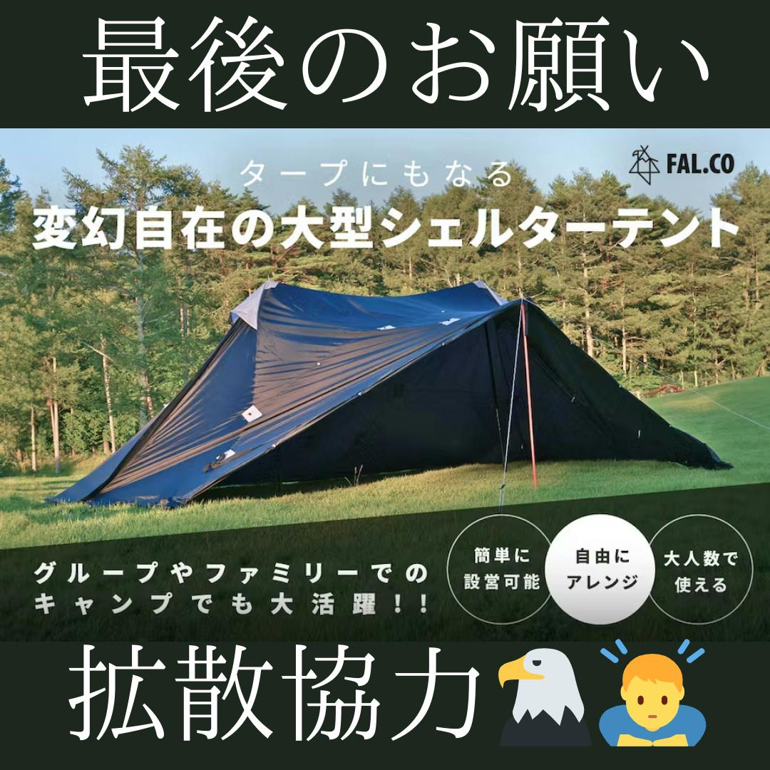 2023/12/15 20:00こんばんは!FAL.COの井口です!いつもご支援をありがとうございます!気付けばあと1週間でこのプロジェクトは終了となります・!ご支援を頂いた皆様、本当にありがとうございます!!昨日、Camp系のインフルエンサーの一人であるウーパパさんがインスタでFALCON SHELTERを紹介してくださいました!!https://www.instagram.com/p/C01FIozP7LD/ALL or Nothingのプロジェクトなので、このままいくとプロジェクトは目標未達で実施不可になります。。私は、どうしてもこのFALCON SHELTERをリリースしたい。。残り6日でやれることは本当に限られてきていますが・・・。まだまだ多くの方の目に触れていないのも要因の1つかなと考えております。是非、みなさまのSNSでもFacebook・Twitter・Instagramをしている方はシェアだけでも頂けると嬉しいです・・!! 支援はなくてもいいです。最後の6日間、アクセスを上げるお手伝いだけでも、是非是非お願い致します・・・!!! もっと見る結果よりも納得のいく行動を