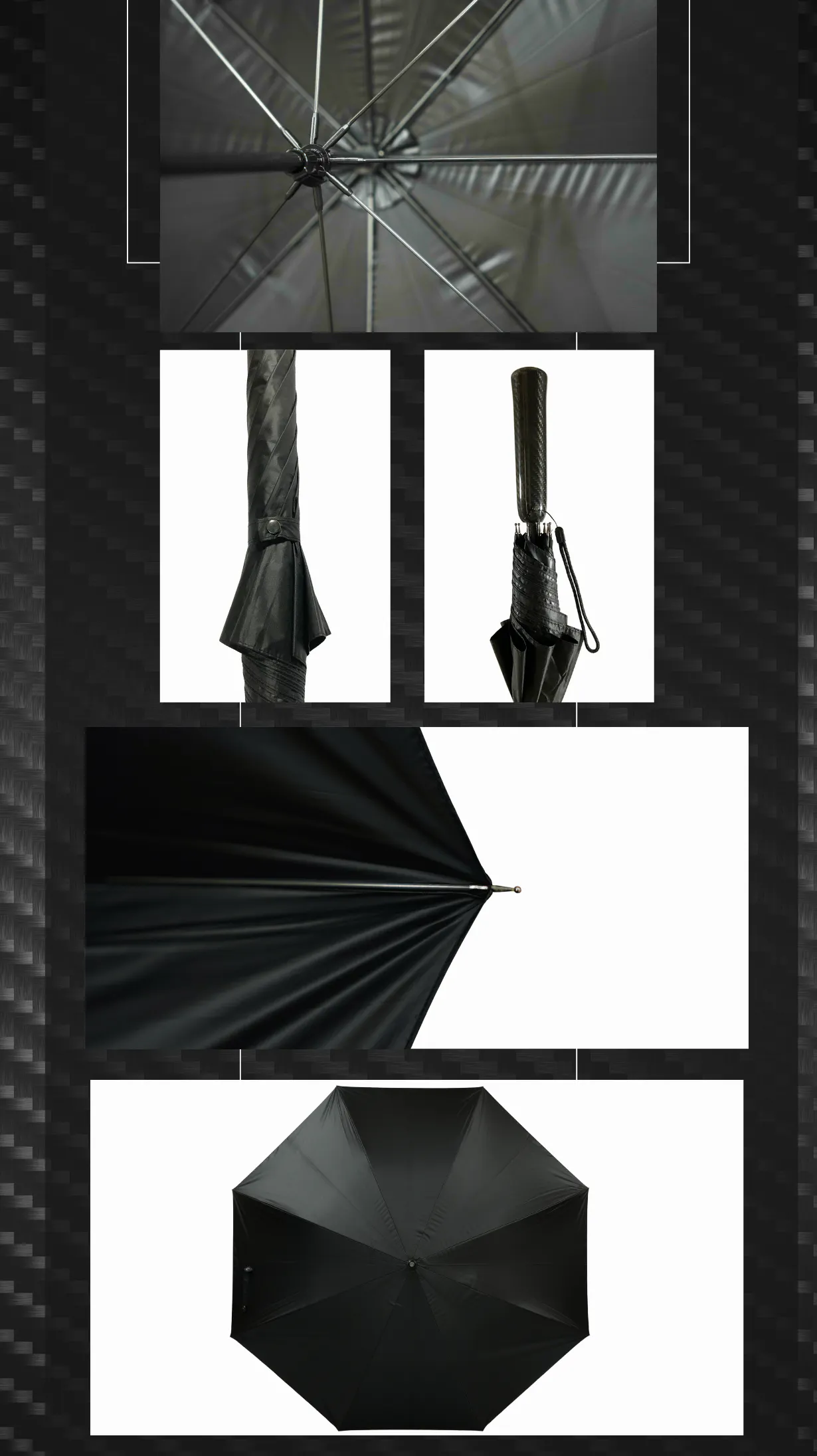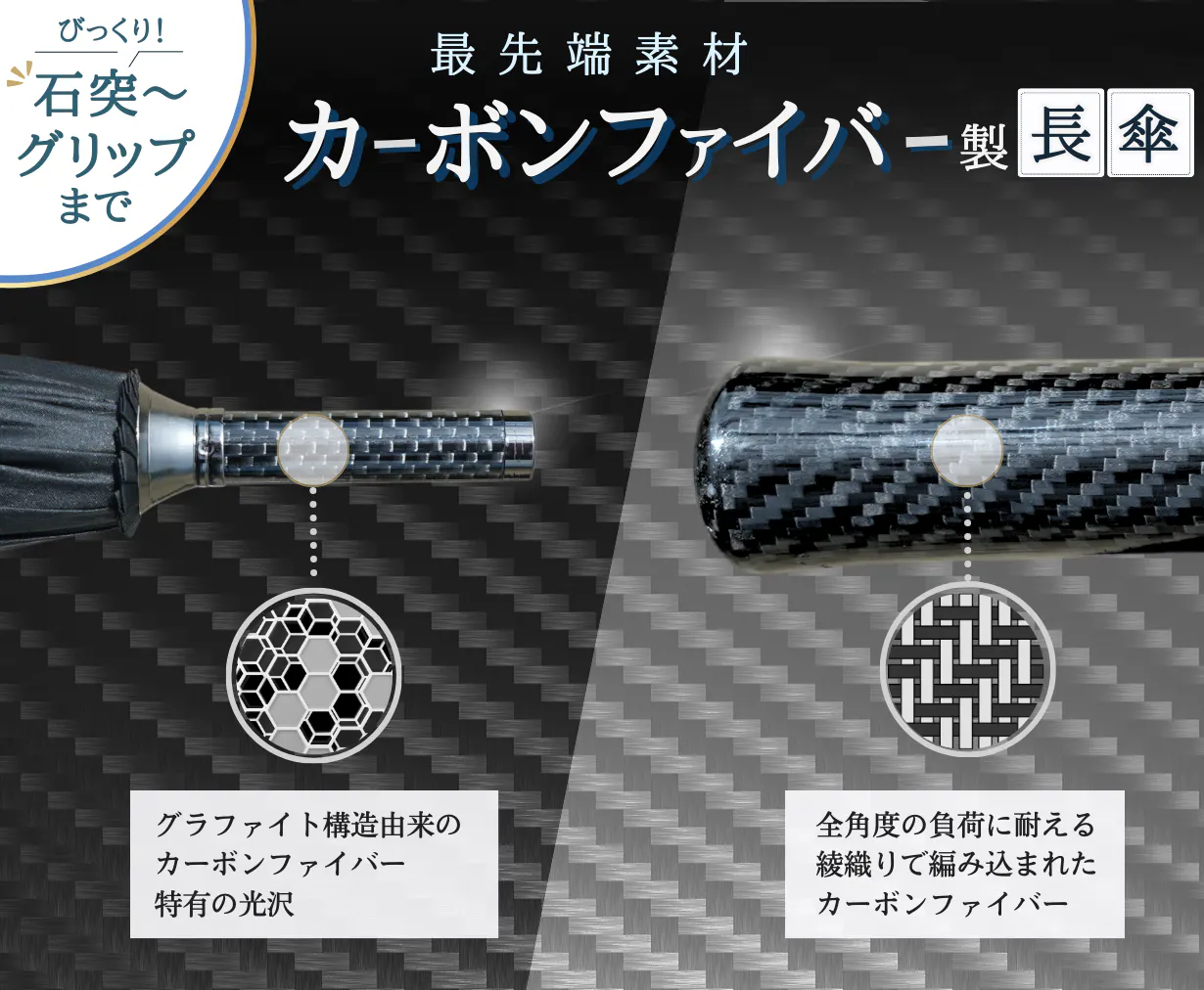 傘の先っぽにある石突から、手元のグリップまで、使えるところには全てカーボンファイバーを使用したこだわりの長傘です。