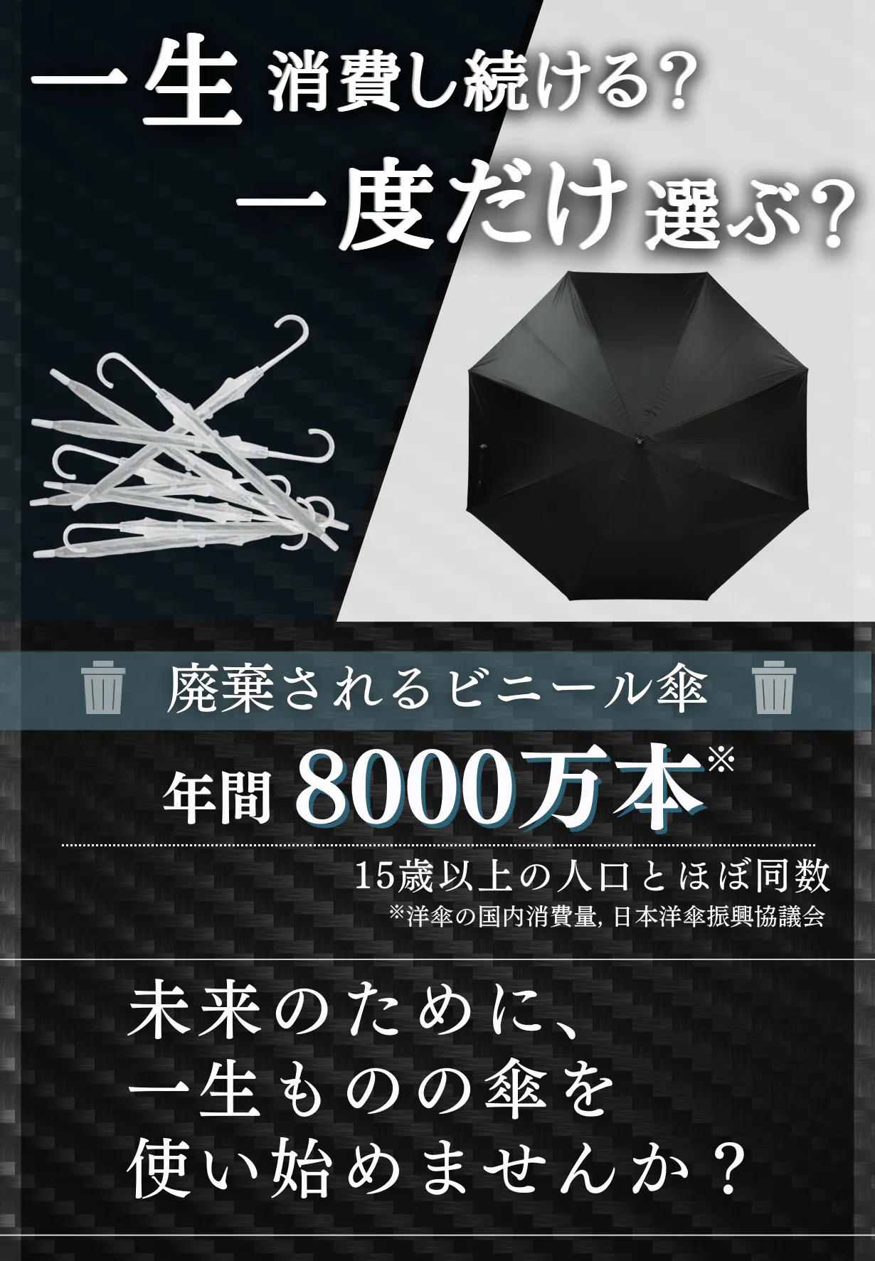 次の世代のためにも、一回しか使わないような使い捨て傘をなくし、一つの傘を長く使い続けませんか?