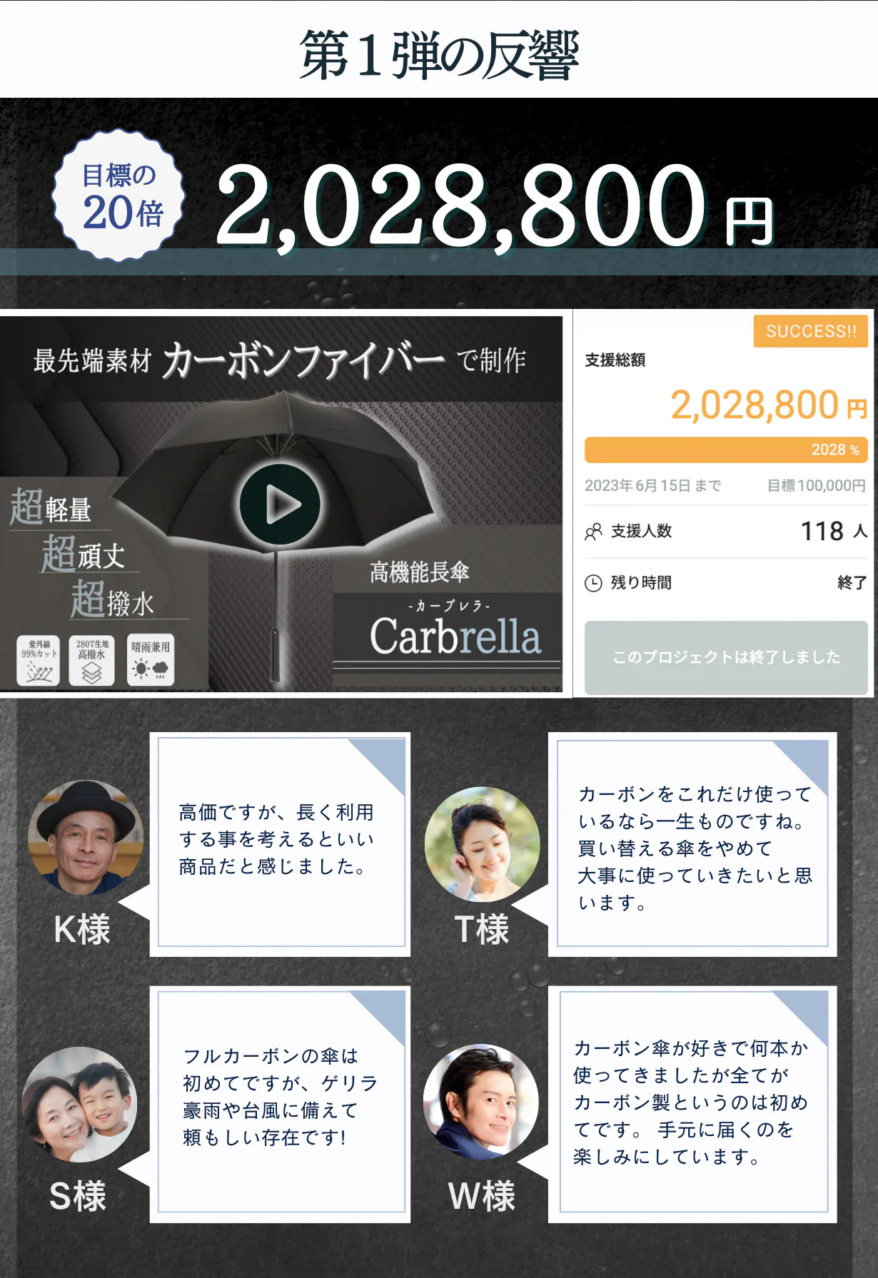 1回目のプロジェクトでは多くの方に賛同いただき、目標金額の約20倍のご支援を頂きました。今回プロジェクトでは、大きさはそのままで軽さを追求した長傘をお届けします。