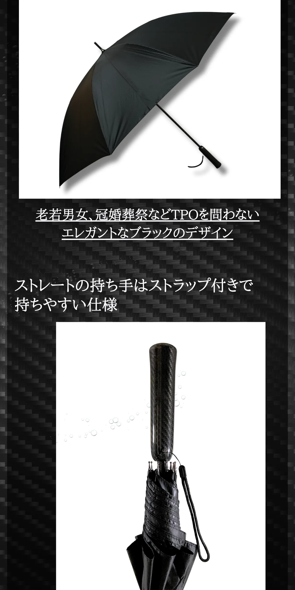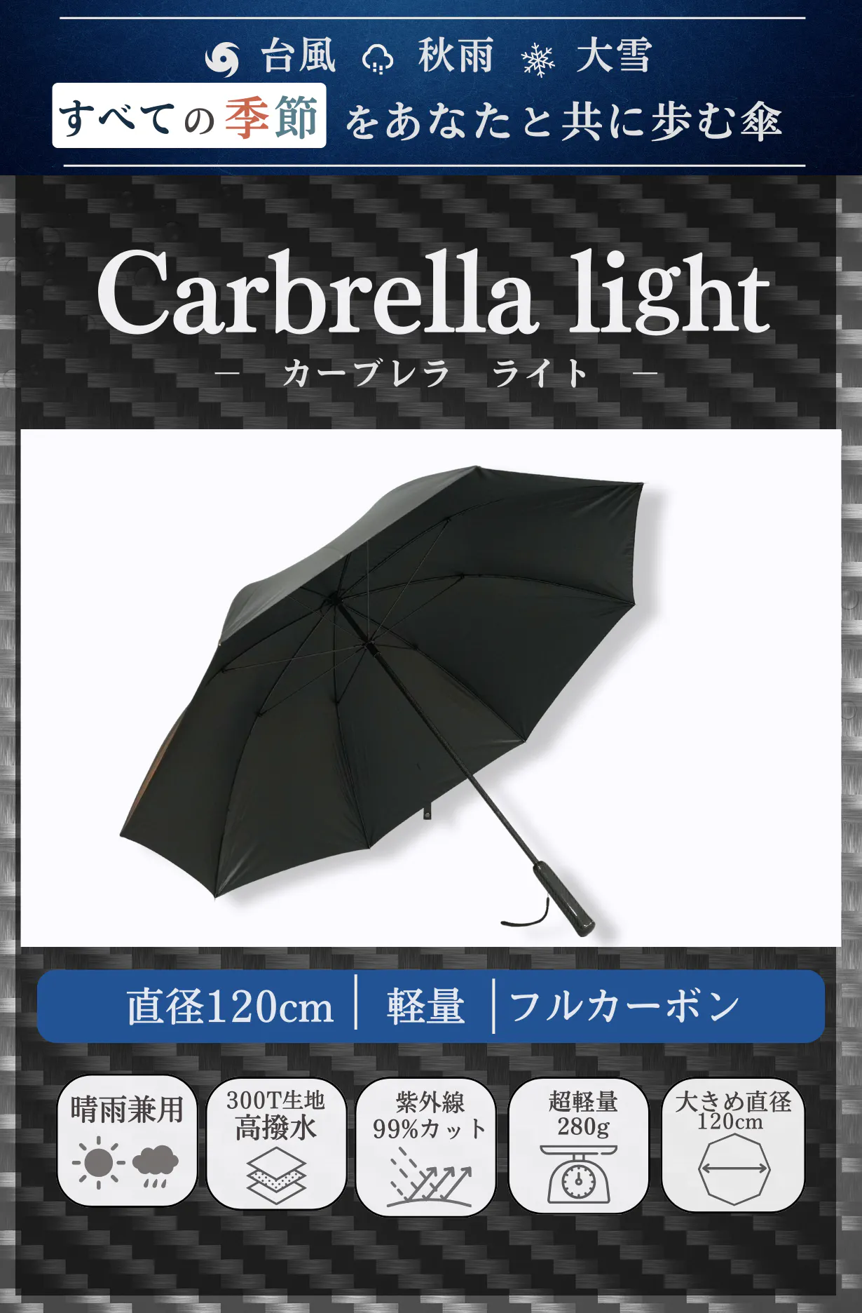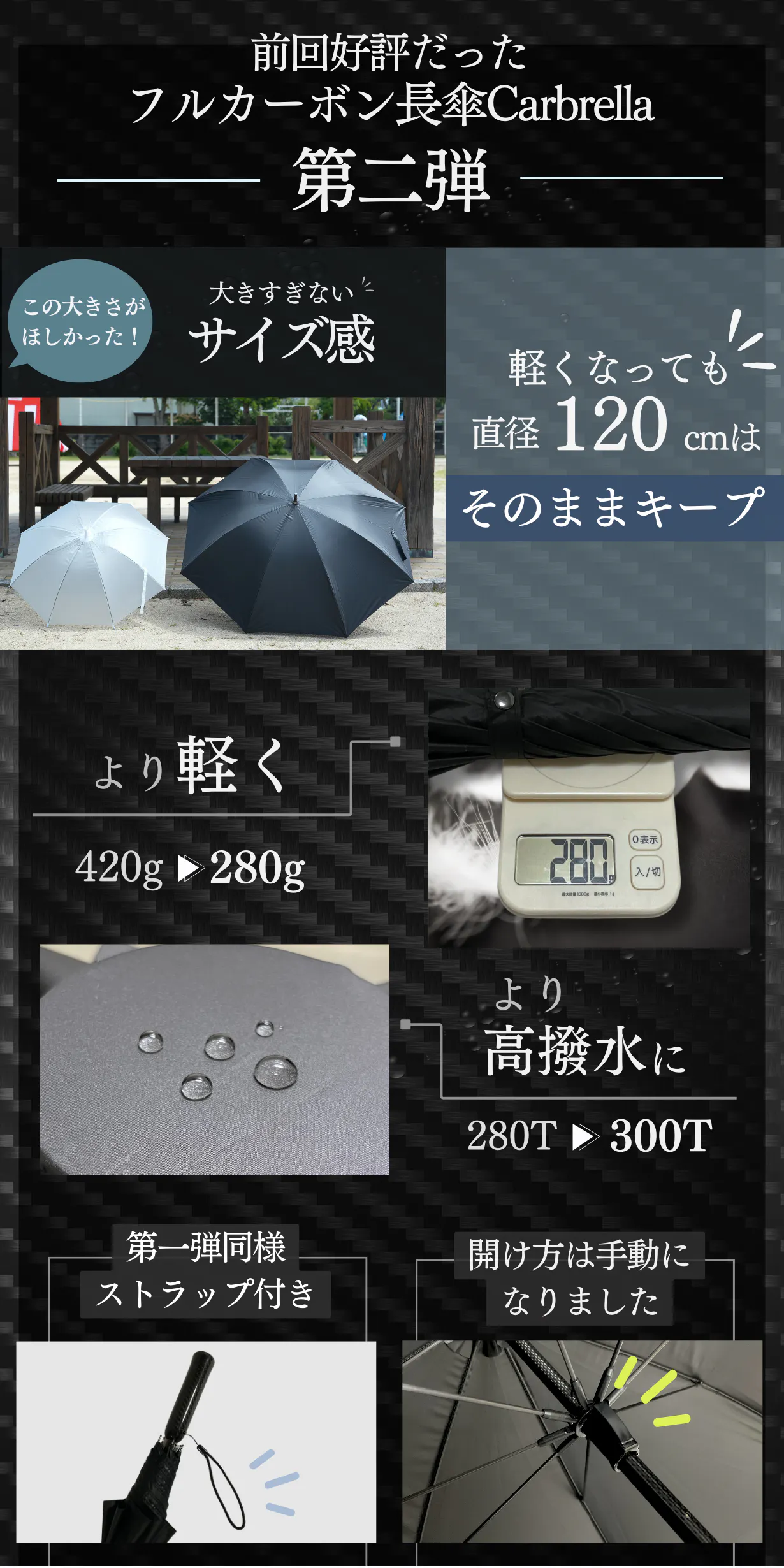 今回ご紹介するのはそんなお悩みを解決する、軽くて大きなカーボンファイバー製の長傘です!